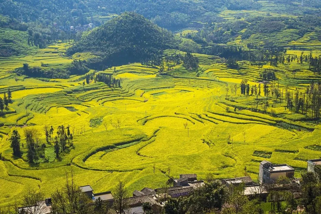 金鸡峰丛中数不胜数的锥状的小山丛,错落有致地排列在坝子里,而环绕着众多锥形的山峰盛开的油菜花,一朵朵成簇,一簇簇成枝,一枝枝花开,一块块大大小小不规则的油菜花田,在阳光的照射下,那雄关万道的气势,涧幽壑深,长空如染的景象,定然让你顿感灵魂飘荡,心旷神怡。