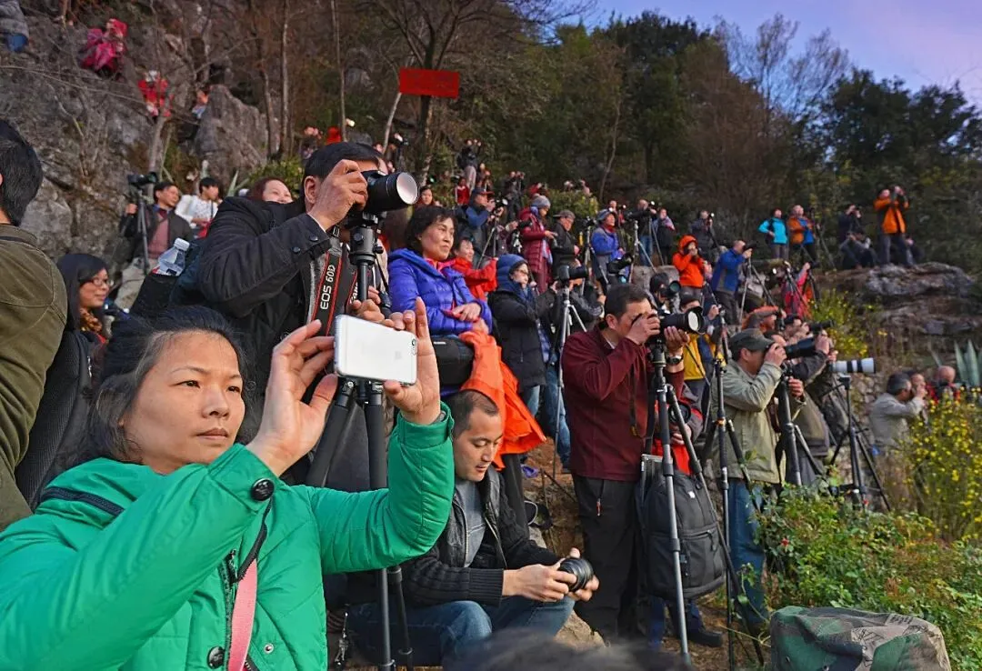 早上6时,摸黑持手电步行去不远的金鸡峰顶,拍摄“花海桂林”——金鸡峰丛万亩油菜花“花海日出”。登上金鸡峰顶可看见一望无际的金色海洋。太阳约7:30跳出山顶,此刻沉浮在花海中的一个个小山头仿佛一座座大海中的岛屿,万亩油菜花竞相开放,稍远处又有孤峰拔起,,满眼的金黄色,令人震撼!自然与人力的“天人合一”完美结合,成就了完美的大地艺术作品。