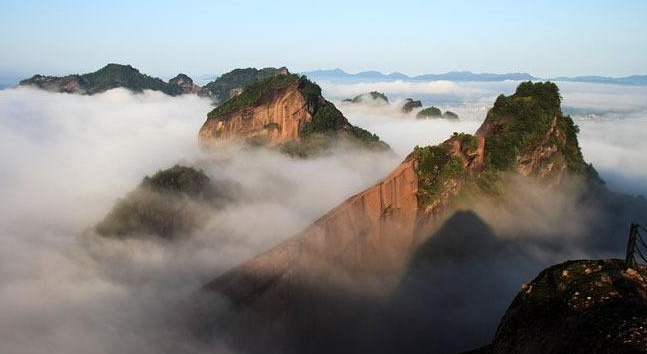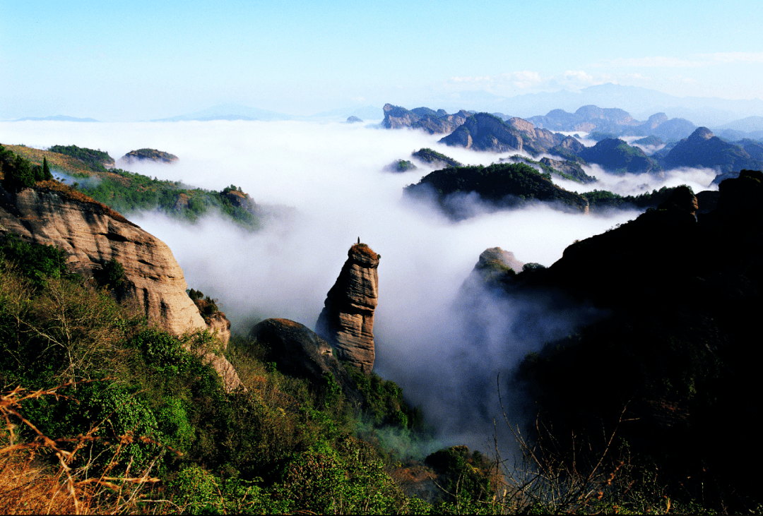 景区方圆123平方公里,集山、水、岩、洞、泉、寺、园诸神秀于一身,雄奇、清丽、幽深,与武夷同属丹霞地貌,被誉为:“北夷南豸,丹霞双绝”。