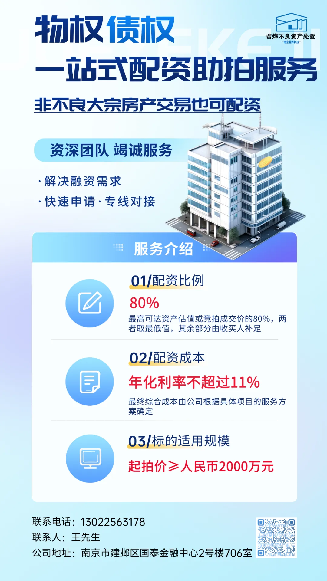 南京君烨科技发展有限公司以专业化、精细化服务构建资产与资本的桥梁。依托多年行业经验与海量数据资源,我们精准研判法拍资产潜在价值,针对不同资产特性与投资人需求,定制个性化配资方案。从资产尽调、风险评估到资金筹措、运营规划,提供全流程一站式服务,有效降低法拍投资门槛与风险,助力合作方高效盘活法拍资产,实现资本增值与资产变现的双重目标,携手实现资产与资本的共赢增值。