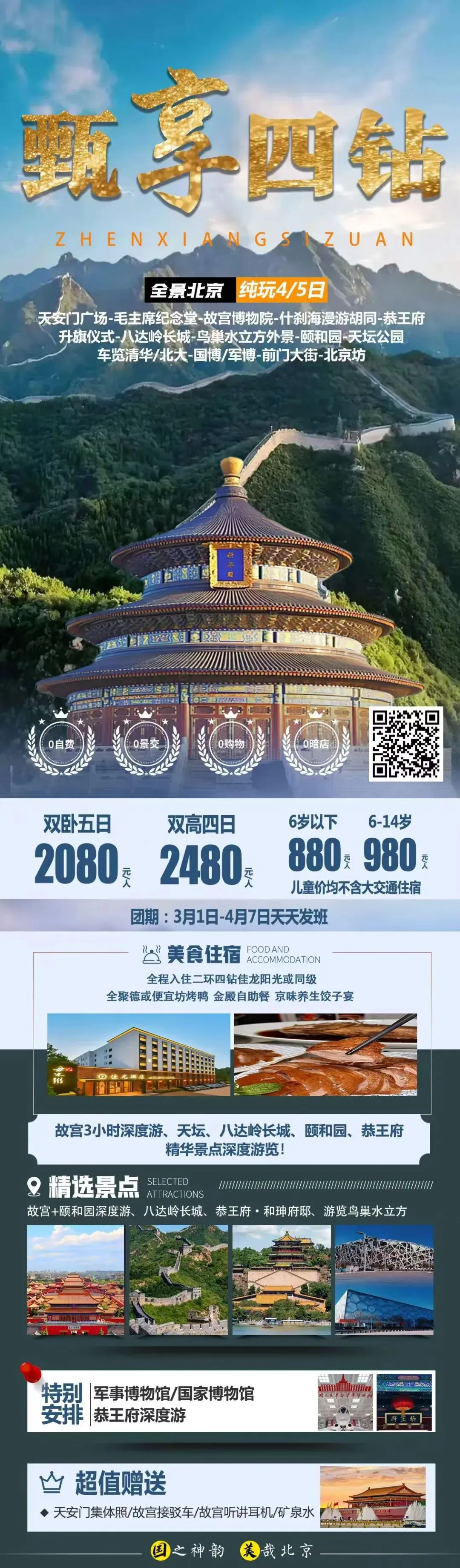 【景区线路】《甄享四钻纯玩北京》高铁4日 火车卧铺5日二选一 天天发团