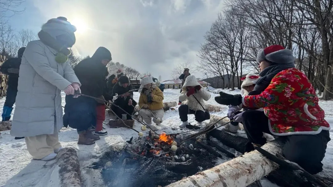 除了沉浸式赏雪玩雪,景区还准备了丰富的民俗与特色体验活动。游客们围坐在一起亲手包饺子,感受团圆热闹的年味;亲手蘸制糖葫芦,酸甜滋味裹着冰雪的清爽,满是冬日童趣;近距离体验林区传统生产作业伐木场景,感受小兴安岭林区的独特文化与历史底蕴。玩累了,热气腾腾的烤馒头、香甜软糯的烤地瓜香气扑鼻,地道的林区特色美食,让游客在冰天雪地中感受到满满的温暖与烟火气。