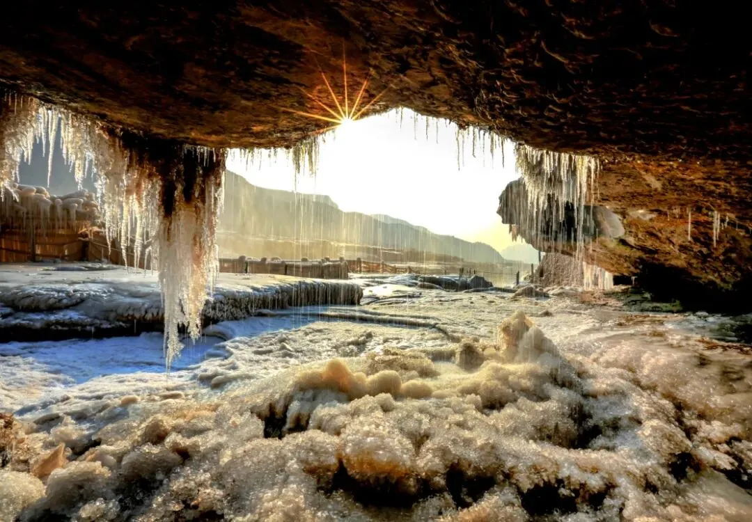 冬天的陕西黄河壶口瀑布 是大地最雄浑的独白 千里黄河挟雷霆之势奔涌至此 在极寒中骤然凝固 怒涛定格为接天的冰崖 仿佛时间都被冻结在这银涛玉垒之间 冰挂玉帘似绣女巧织 晶莹透彻分外妩媚动人 勾勒出一幅气势磅礴的冰雪画卷 (来源:渭南日报)