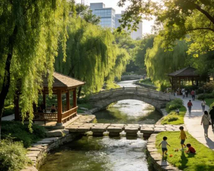 在前门大街的喧嚣之外,藏着一处“藏在胡同里的江南水巷”——三里河公园。因距离正阳门三里而得名,这里经过修整恢复,形成了水穿街巷、小桥流水的江南意境,免费开放、无需预约,是闹市区里难得的清净角落。