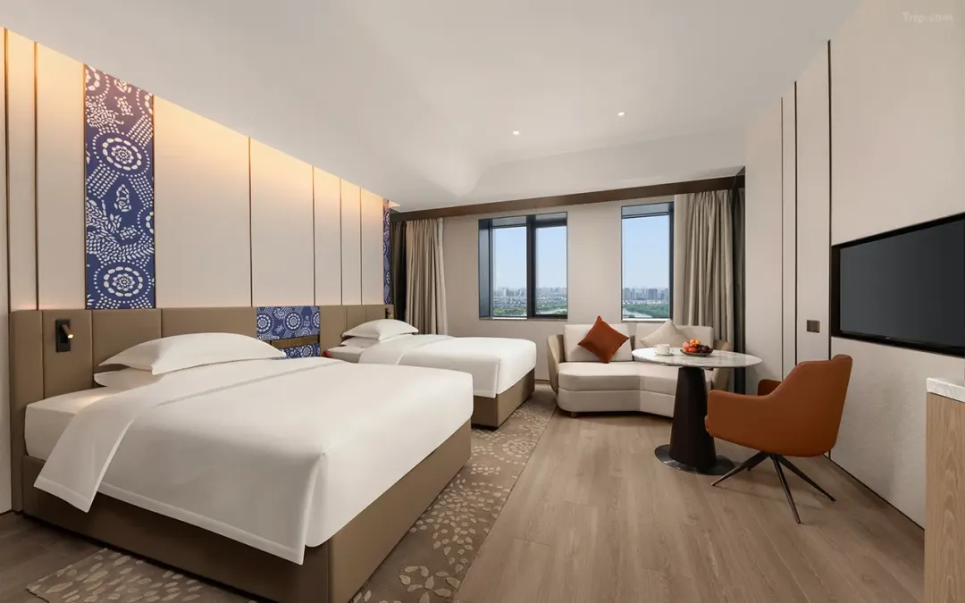 一晚<嘉兴戴梦得开元名都酒店>毗邻南湖景区,身处繁华商业中心,楼下就是戴梦得购物中心,客房为现代中式风格,注重功能性与艺术性的统一,古典与现代相结合。