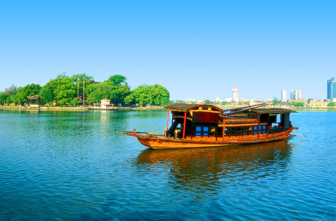 嘉兴南湖:春来南湖,红船静泊于粼粼碧波,湖畔桃红柳绿相映成画。