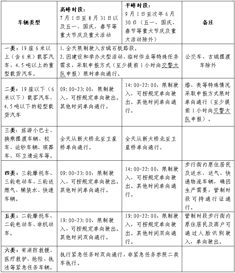 注:1.步行街内原住居民三轮摩托车、三轮电动车确因生产生活需要,由车辆驾驶人提出书面申请,所在社区签字确认后,到古城景区管委会办公室办理通行证单向通行。