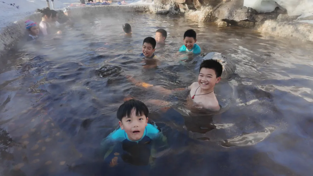 踏入小镇,团员们瞬间被这处集森林体验与温泉疗愈于一体的国家4A级旅游景区所吸引。小镇群山环抱,最让孩子们欢呼雀跃的当数室外森林温泉体验。在零下十摄氏度的气温中,孩子们浸泡在热气氤氲的温泉池里,四周是银装素裹的林海,视觉冲击感十足,真切感受了“冰火两重天”的独特魅力。