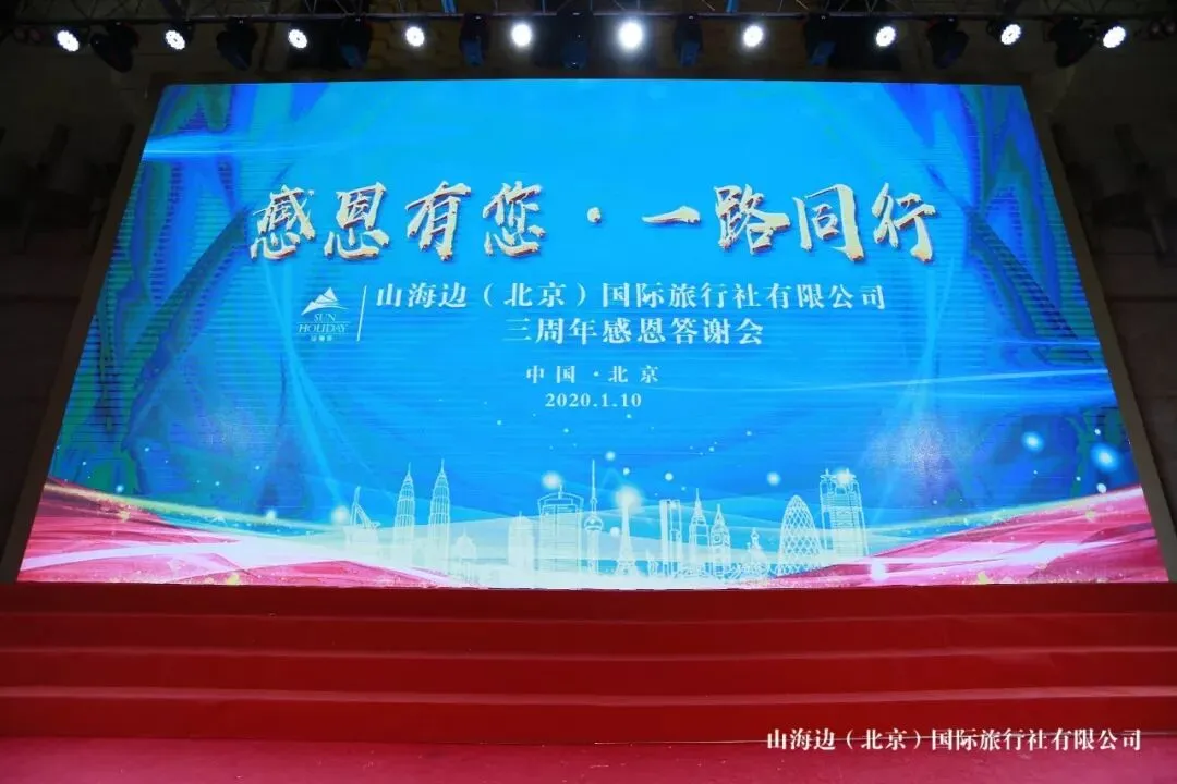 2020年1月10日,山海边国际旅行社三周年感恩答谢会圆满举办。山海边国际旅行社以“感恩有您 · 一路同行”为年会主题,邀请旅业三百余位合作伙伴欢聚一堂,共庆山海边成立三周年,和平天下集团总裁张志利作为重要嘉宾受邀出席。