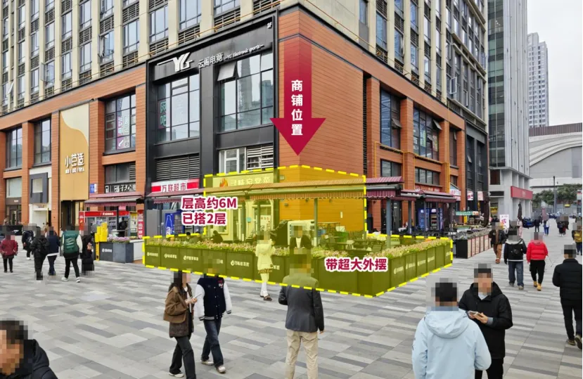 4.重餐饮转角铺,大开间,已搭建 2 层,自带大外摆约 110 平;