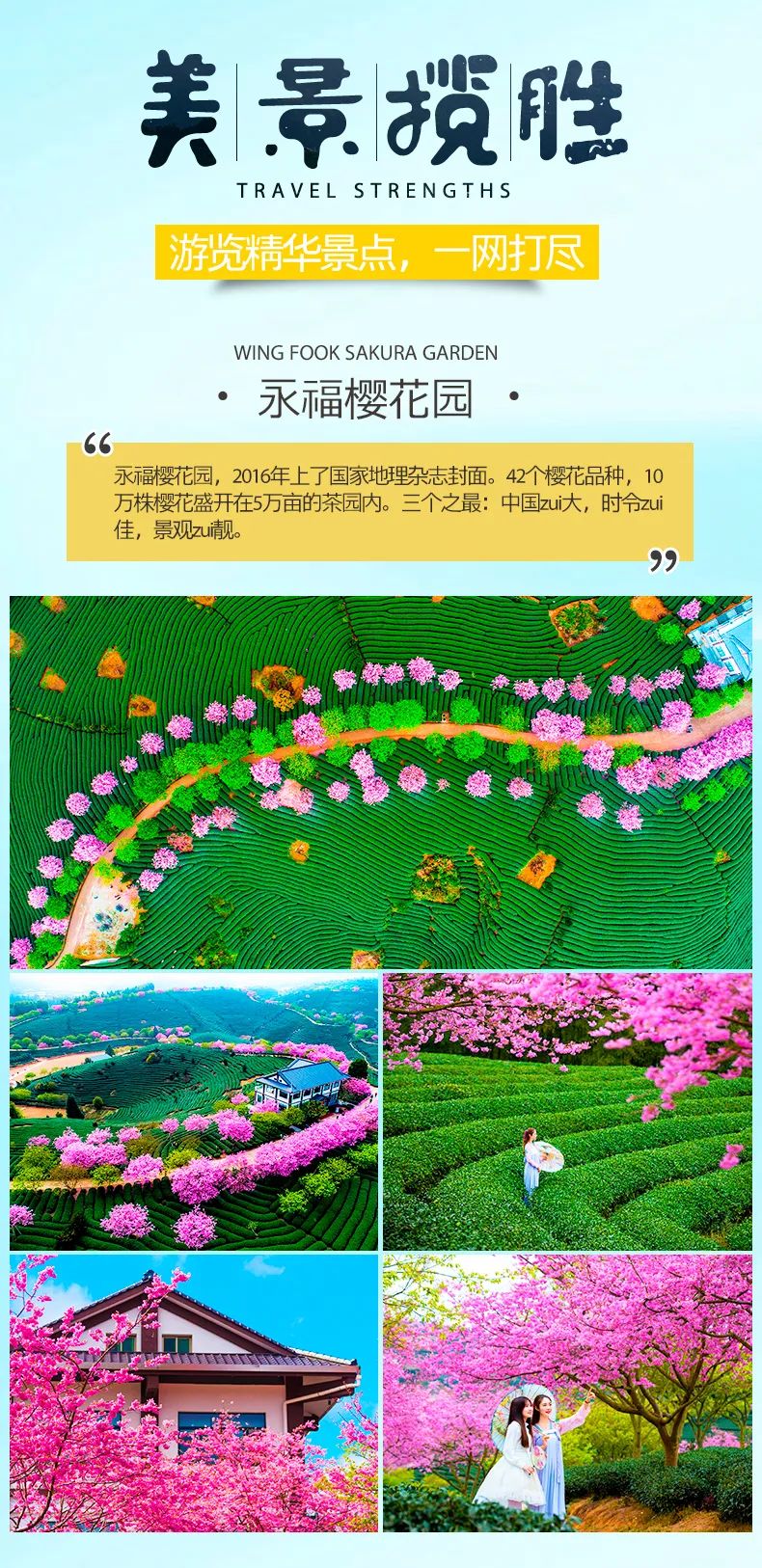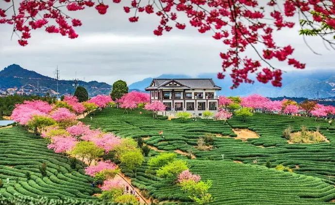 【台品樱花茶园】永福茶樱园,既是茶园又是樱园这里盛开的樱花伴着翠绿的千亩茶园,错落有致的蜿蜒在山坡,极目远眺,雅致极了!万亩茶山中漫山遍野的樱花,红中透着粉,粉中带着紫,每一朵都牵动人心。有了这三个"全国之最",漳平永福迅速成为我国赏樱的一处"后起之秀"。也因如此,我们便不难理解永福樱花为何受各地百姓宠爱了。(花期观赏效果非人为可控。如因天气等外界因素影响未达到预期,尽请谅解。)