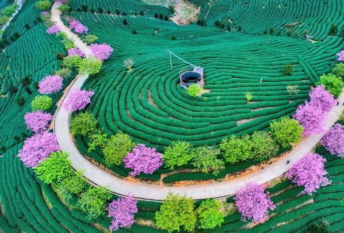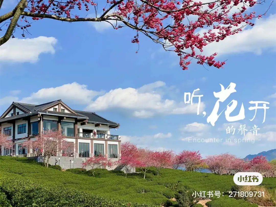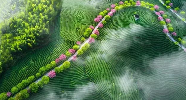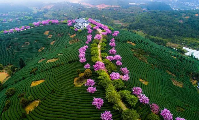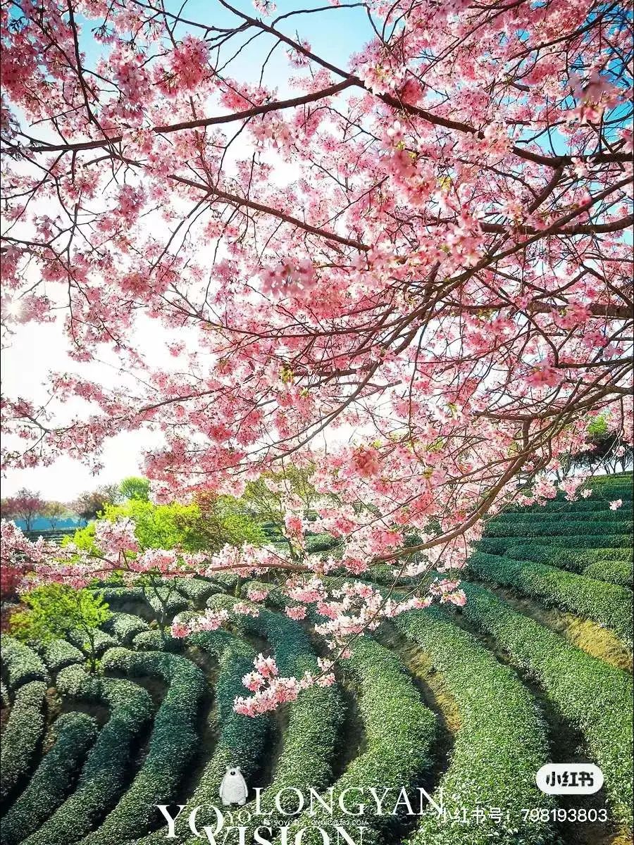 茶绿樱红!红色的樱花与满山碧绿的茶叶交相辉映,远远望去,依茶山走势种下的一棵棵盛放的樱花,像极了五线谱上跳动的音符,谱写着茶树与樱花相恋相守的浪漫乐章,茶园清新,樱花娇艳,景观美极了!
