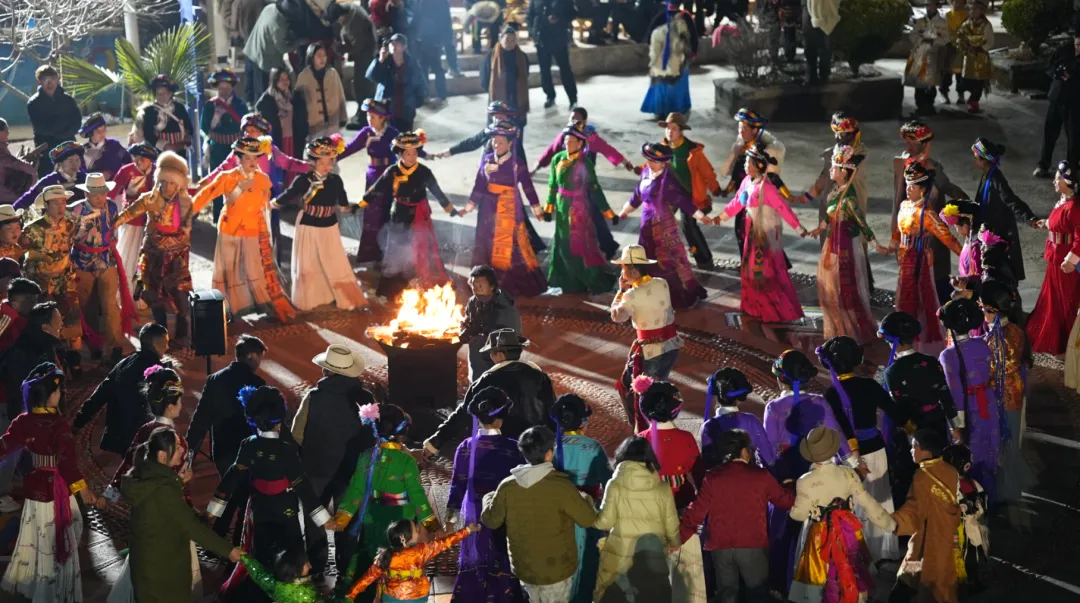 夜幕降临,湖畔的村寨里篝火燃起,“甲搓舞”热烈开跳。游客与当地群众手拉手踏歌共舞,在音乐与火光中共享节日欢愉。参加完甲搓舞的广东游客说:“第一次穿上色彩鲜艳的民族服饰参与甲搓舞,大家对民族文化都非常尊重、热爱……手拉着手,感觉我们就是一家人。”