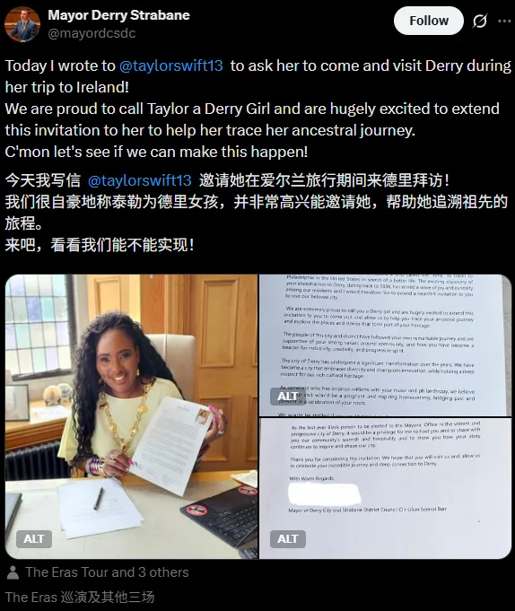当泰勒·斯威夫特即将踏上都柏林的演唱会舞台前夕,爱尔兰移民博物馆公布了一项激动人心的发现:泰勒的高曾祖父母于1836年从德里港登船远渡重洋。德里市长立刻向她发出正式邀请,在公开信中热情写道:“我们自豪地称你为德里女孩”。