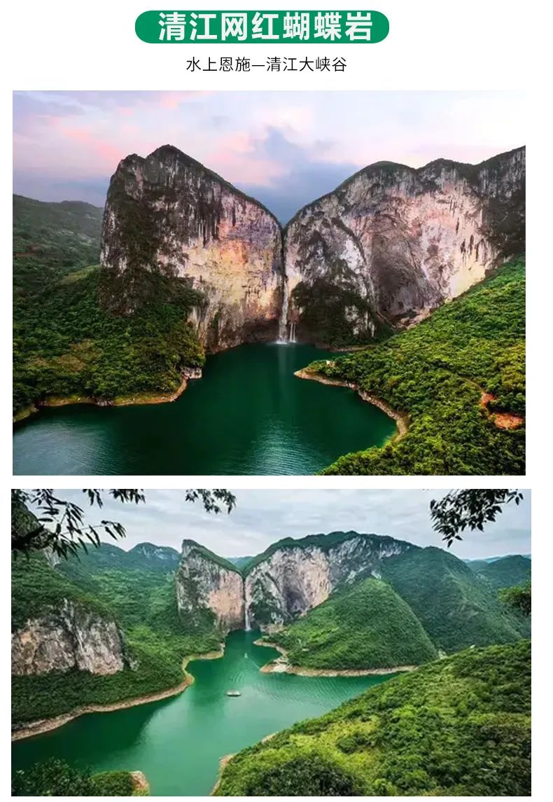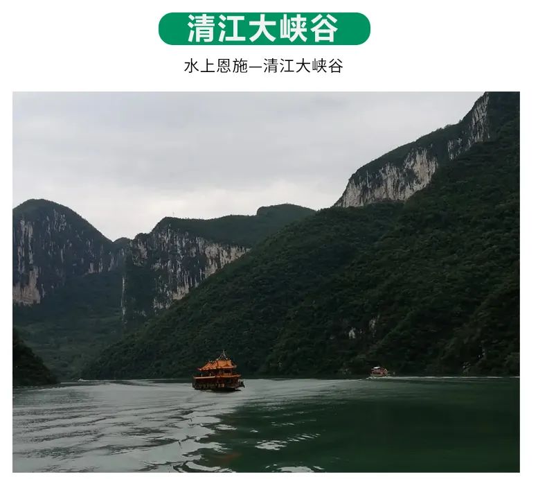 早餐后,乘游轮游览国家AAAA级景区恩施【清江风景旅游区】(游览时间5小时)。清江,古称夷水,全长八百里,或咆哮奔腾,或飞珠溅玉,或潜伏地心,或激荡明崖,自西向东横贯恩施土家族苗族自治州,哺育了世世代代土家儿女,被称为"土家人"的母亲河。被中外游客赞誉为:中国最清江,土家最美河。游览【清江明珠-蝴蝶岩】蝴蝶岩是清江上的一颗明珠,是从未被人踏足的一片神秘处女地,是清江上唯一具备上岸观光、体验、休闲功能的悬崖洞穴景区。(如遇暴雨或其他原因,不能上岸,不退任何费用,敬请理解)浏览结束后返回恩施