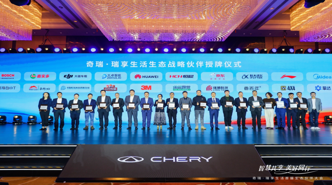 大会期间,奇瑞与中国旅行社协会自驾旅行分会、华为、京东、科大讯飞、大疆、美的等20家战略生态伙伴举行了合作授牌仪式。意在秉承协同聚合理念,积极夯实共赢价值。