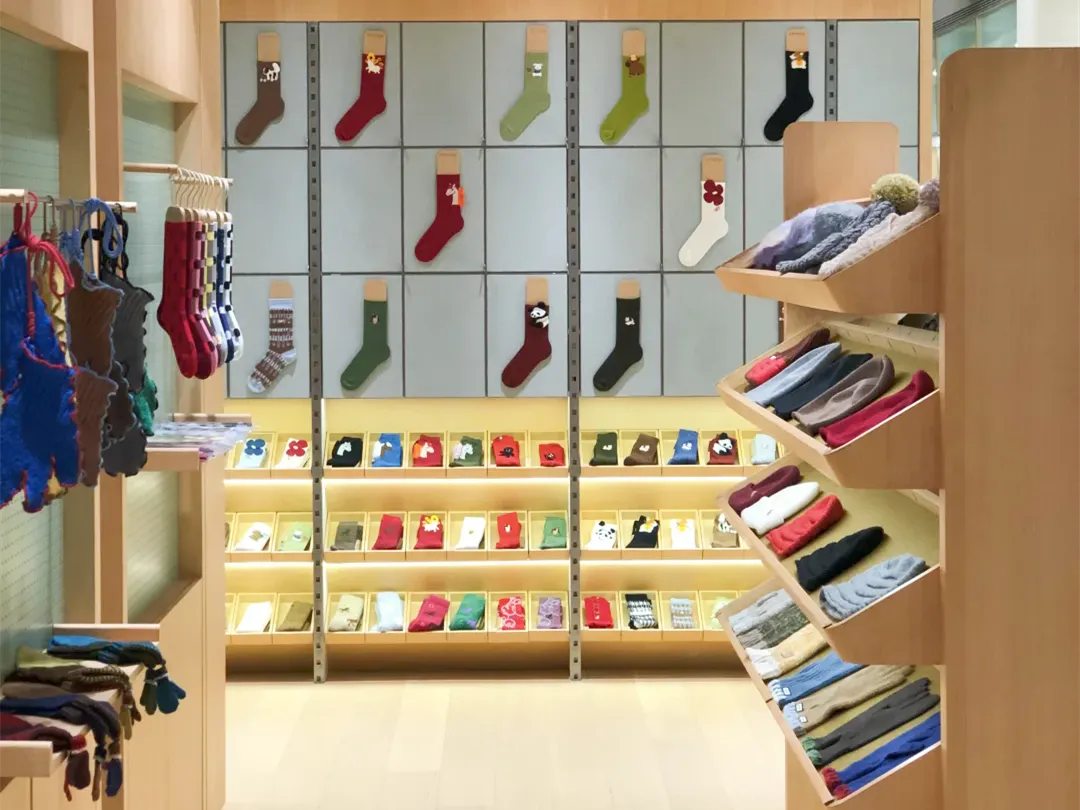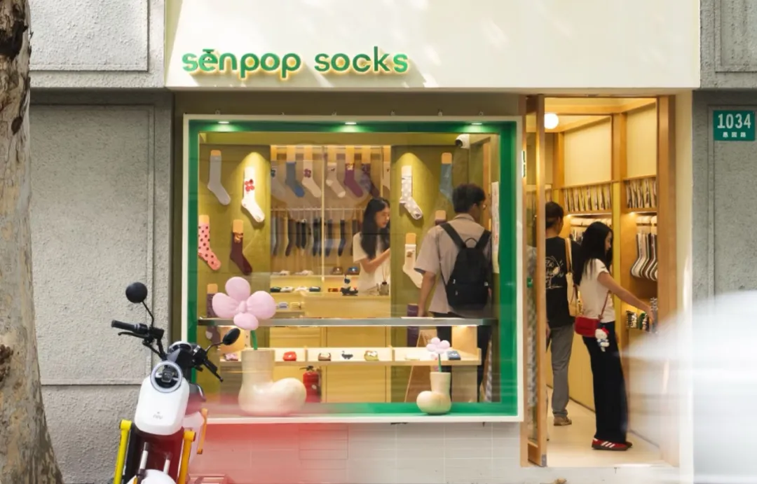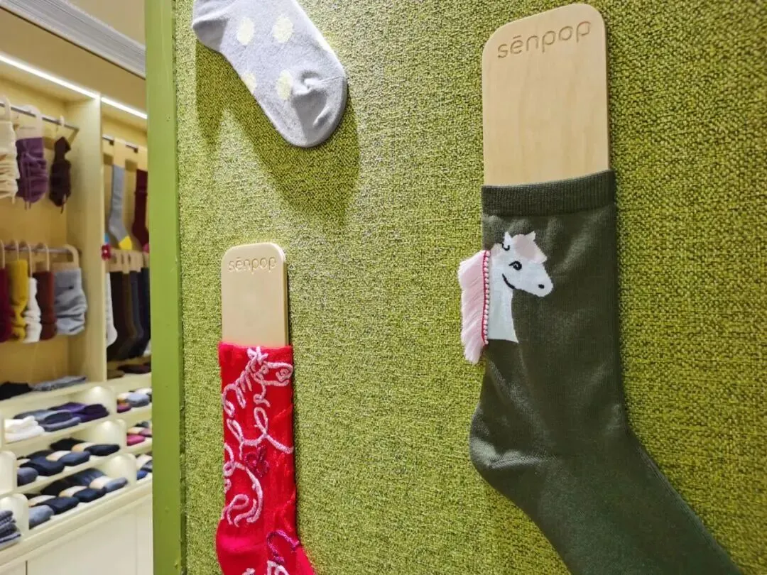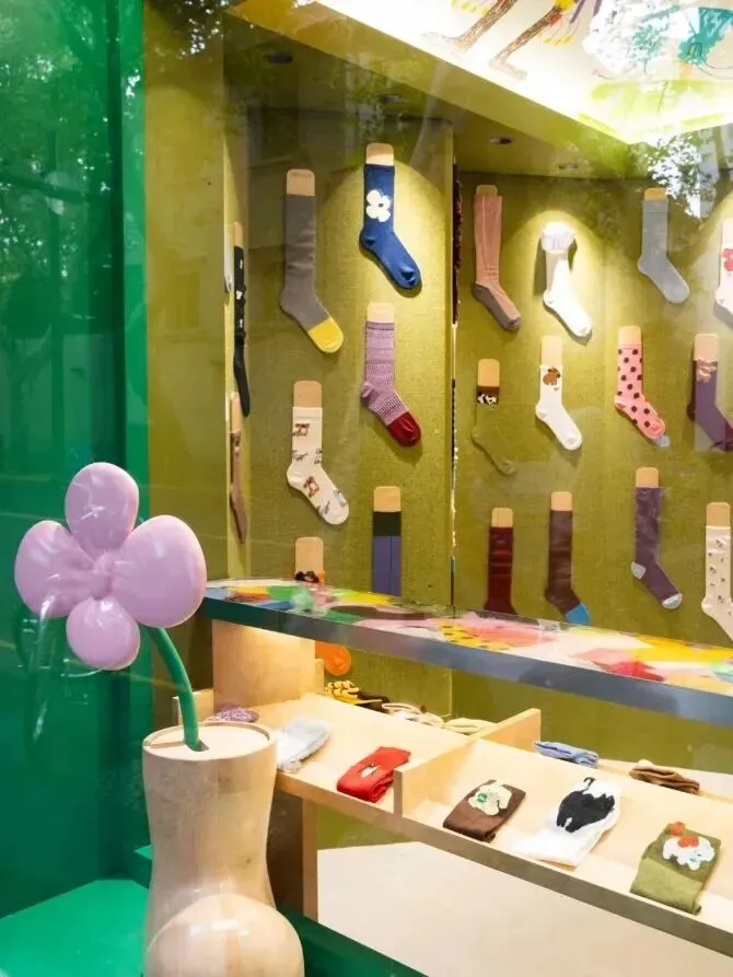 值得一提的是,于2022年在愚园路开业的上森派系全国首店焕新升级,现已成为专注做袜子的小店,品牌携手“95后”青年插画师孙佳艺,打造了一整面袜子展示空间,让每位到访者都能“抬头见斑斓,低头选快乐”。