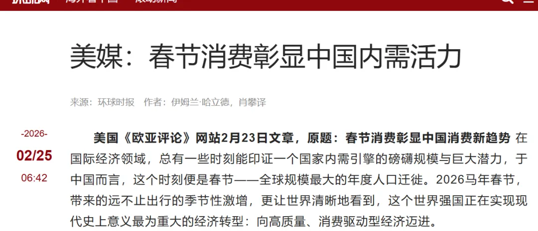 美国《欧亚评论》则把目光聚焦在全球规模最大的人口迁徙——今年人员流动量接近95亿人次。这样庞大的流动不仅展现中国内需的强劲,还揭示了经济转型的深度。以往春节购物以新车、新手机等实物消费为主,如今越来越多家庭转向旅游。比如阿勒泰滑雪场、哈尔滨冰雪节、以及西安年味活动都成为热门打卡地,目的地酒店一房难求。这一变化说明中国消费者愈发理性成熟,不再盲目追求物质,而是更看重体验和情感价值。