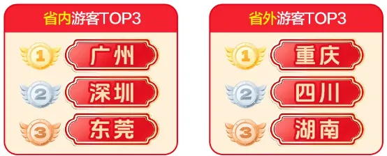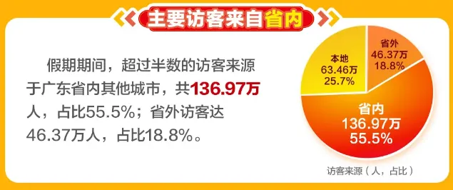 春节假期期间,全市重点景区累计接待游客181.72万人次。其中本地游客102.71万人次,占比56.5%;省内跨市游客51.43万人次,占比28.3%,以广州、深圳、东莞等珠三角城市游客为主;省外游客27.58万人次,占比15.2%,主要客源地包括重庆、四川、湖南等地。