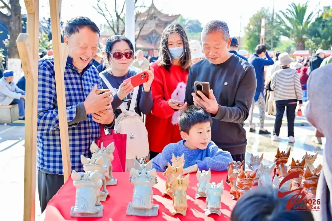 民俗巡游与非遗市集营造浓厚年味。“狂想花屿·喜迎新春”民俗巡游中,传统的大头娃娃、划旱船与身着鲜花元素服饰的“花仙子”队伍交织行进,宛如一幅活态民俗画卷。“开运好市·繁花似锦”非遗集市汇聚瓦猫、剪纸、甲马、刺绣等手工艺品,以及臭豆腐、豌豆粉、米糕等传统小吃,让游客零距离感受非遗在当代生活中的鲜活魅力。