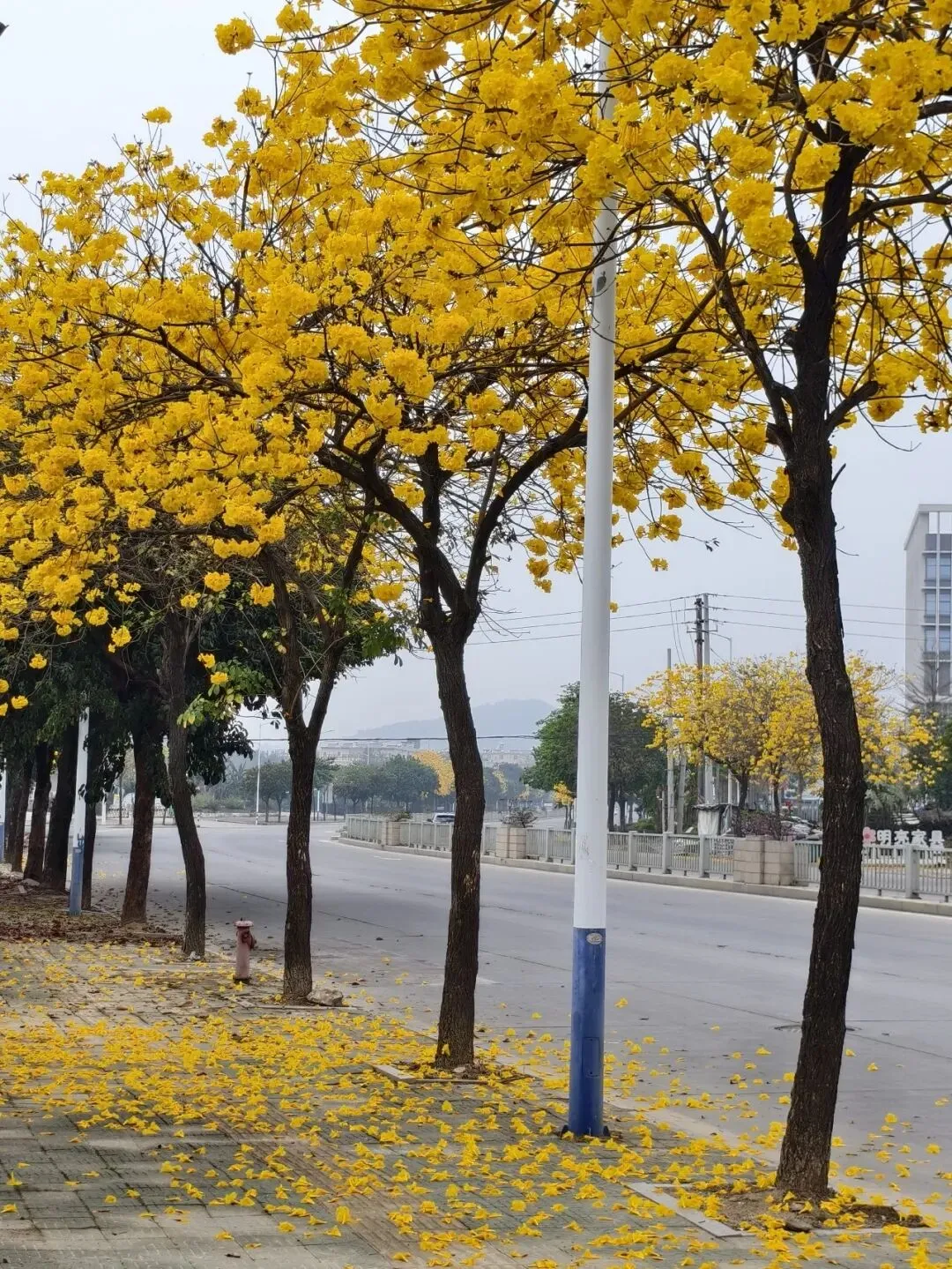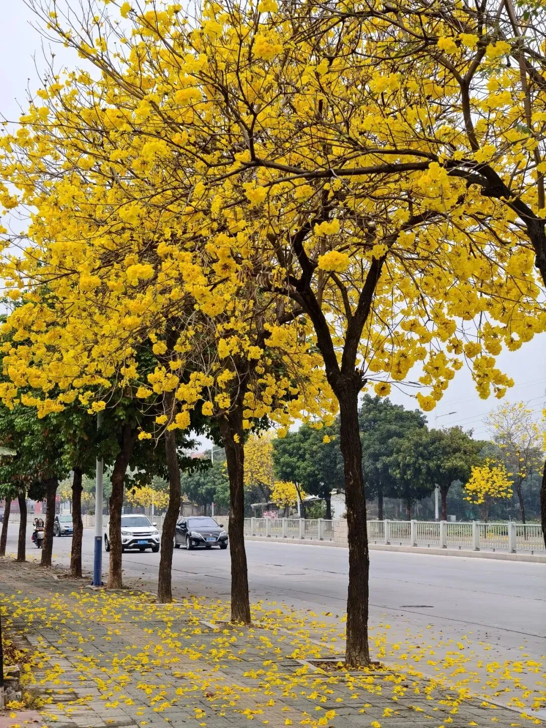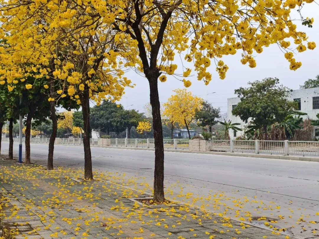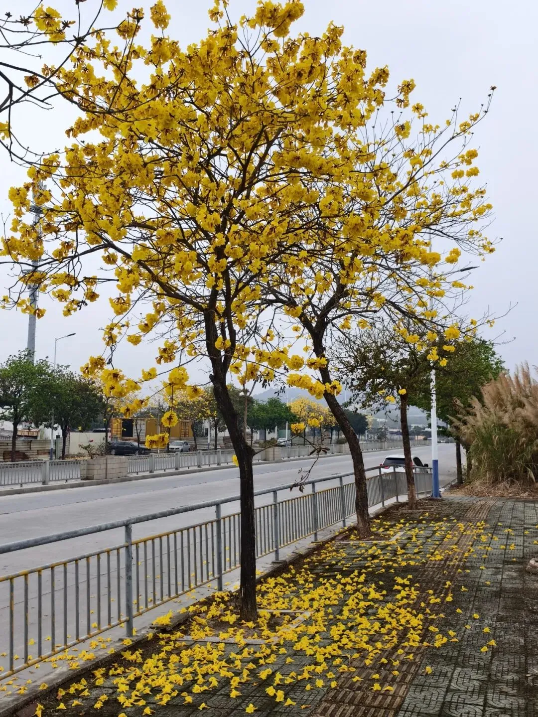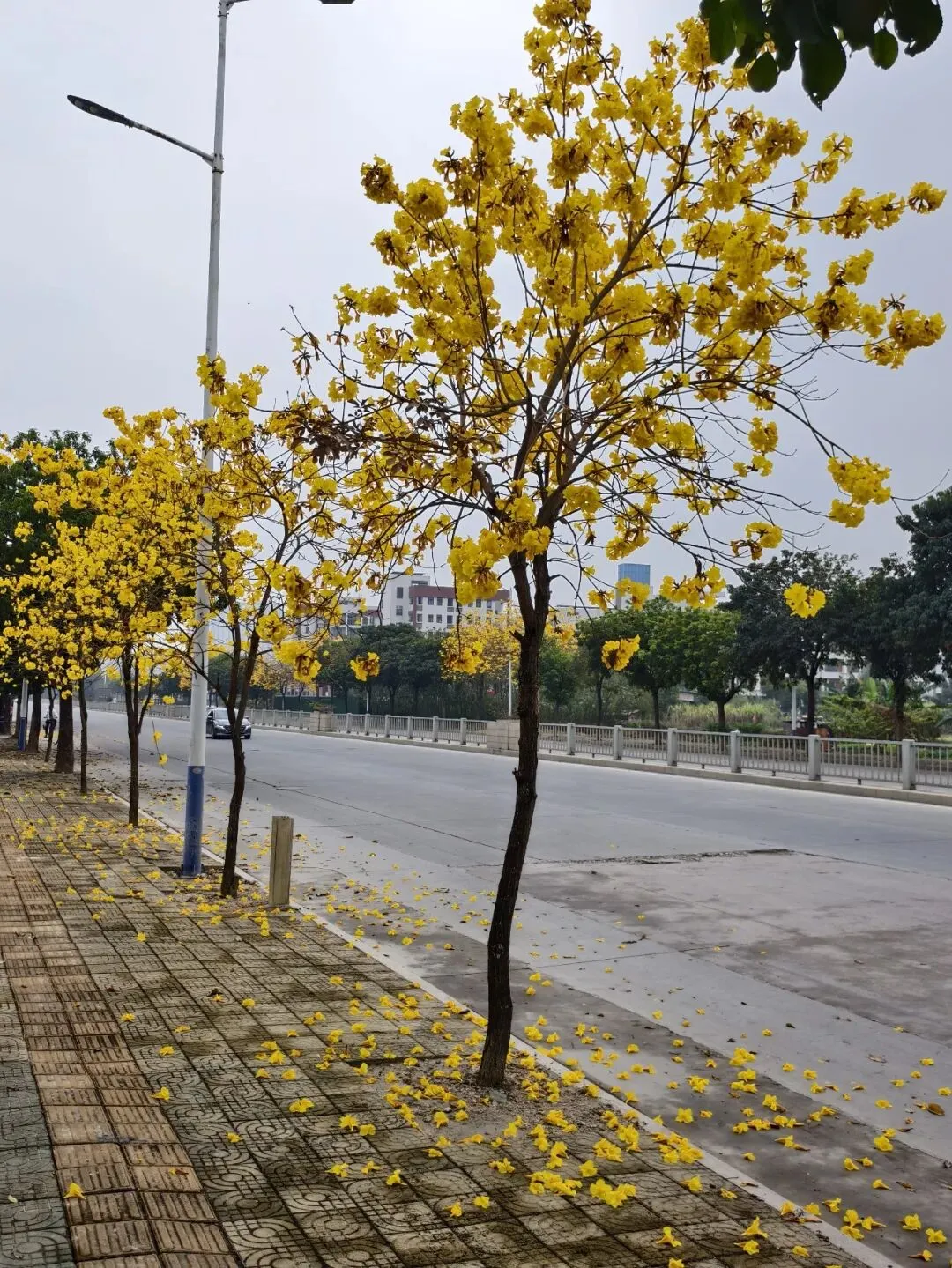 在揭阳市揭东区“县城”东面的车田大道上,两旁的黄花风铃木已盛开,一部分春节前后开的花瓣逐渐落地。树根旁,堆满金黄色的风铃花。(估计环卫工人要花费一定时间工作了,辛苦了!)