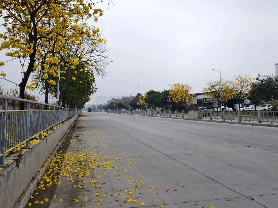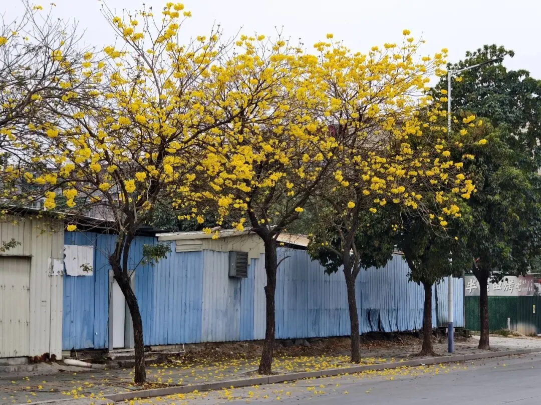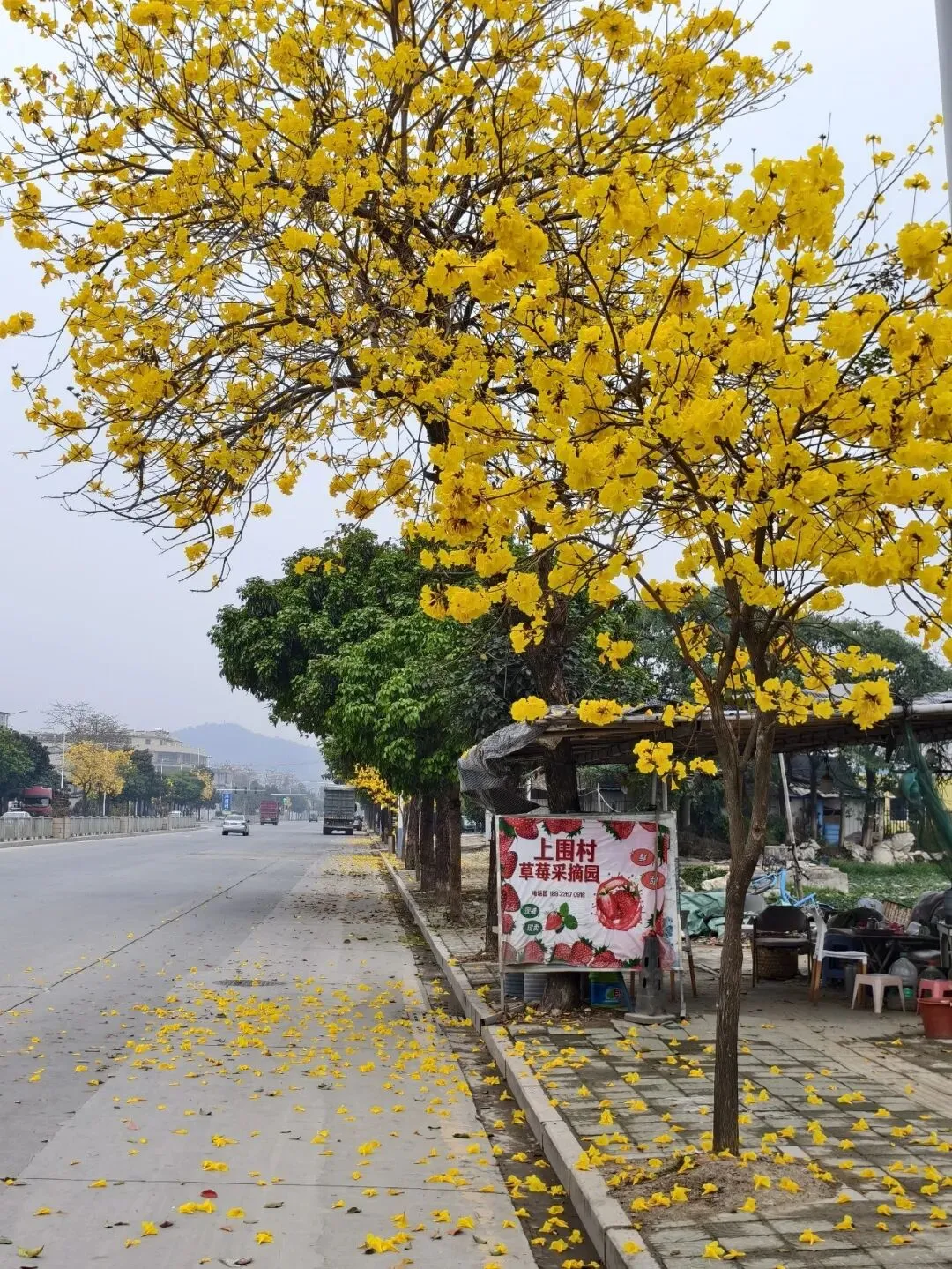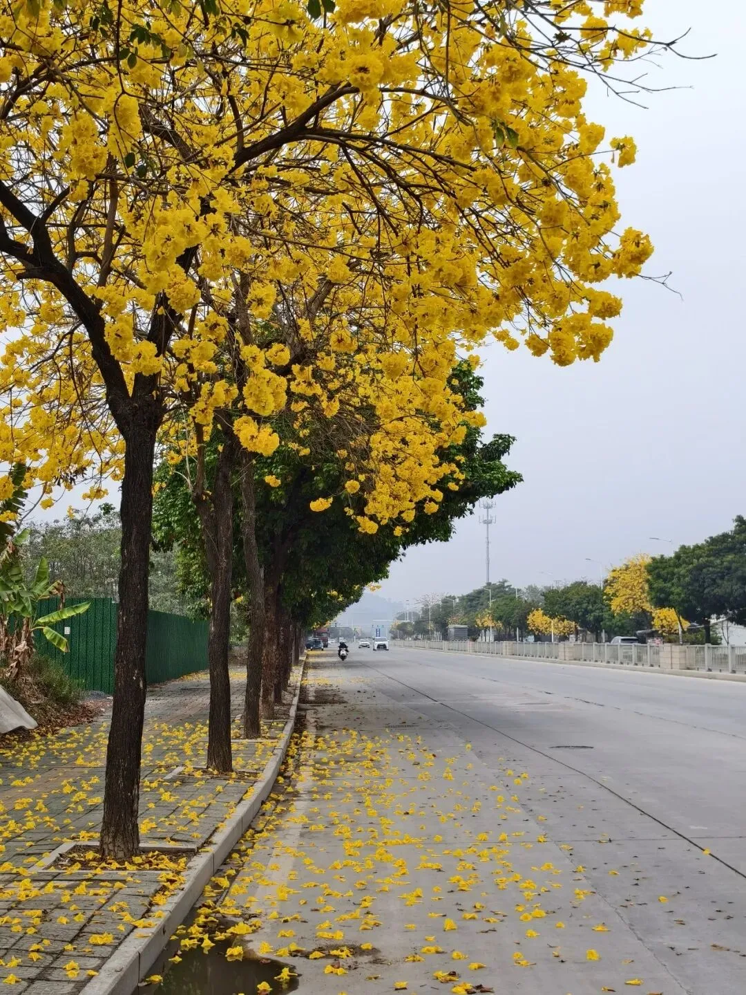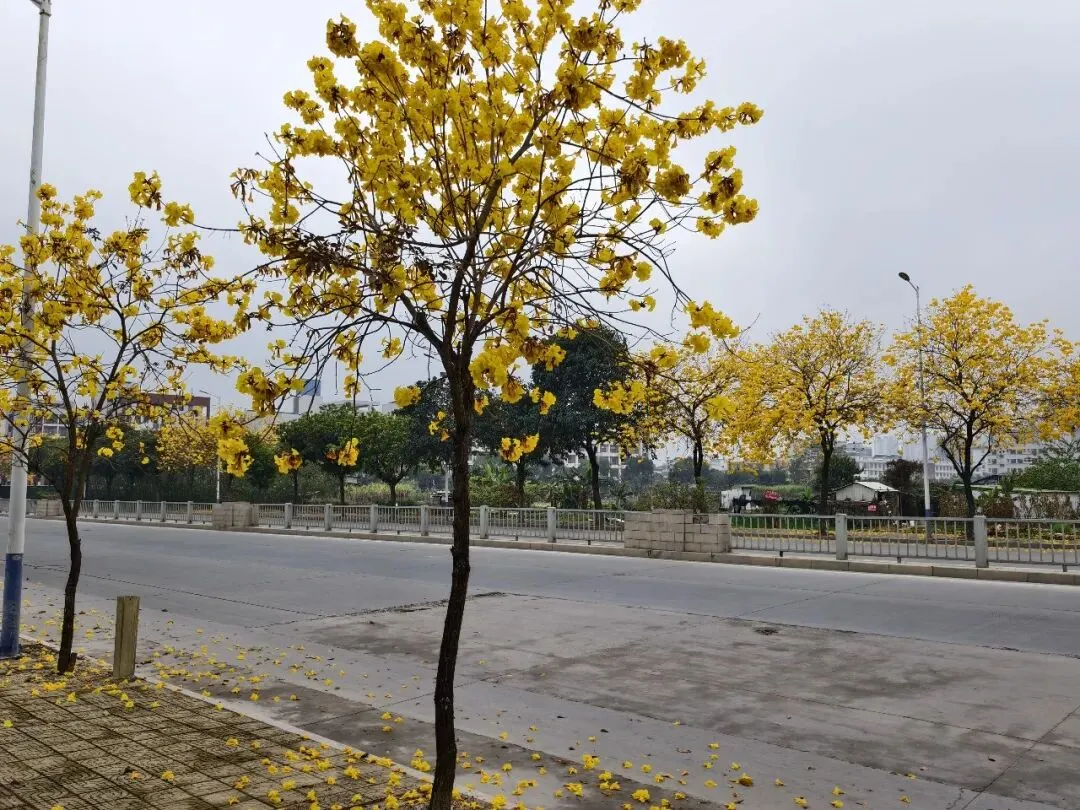 在揭阳市揭东区“县城”东面的车田大道上,两旁的黄花风铃木已盛开,一部分春节前后开的花瓣逐渐落地。树根旁,堆满金黄色的风铃花。(估计环卫工人要花费一定时间工作了,辛苦了!)