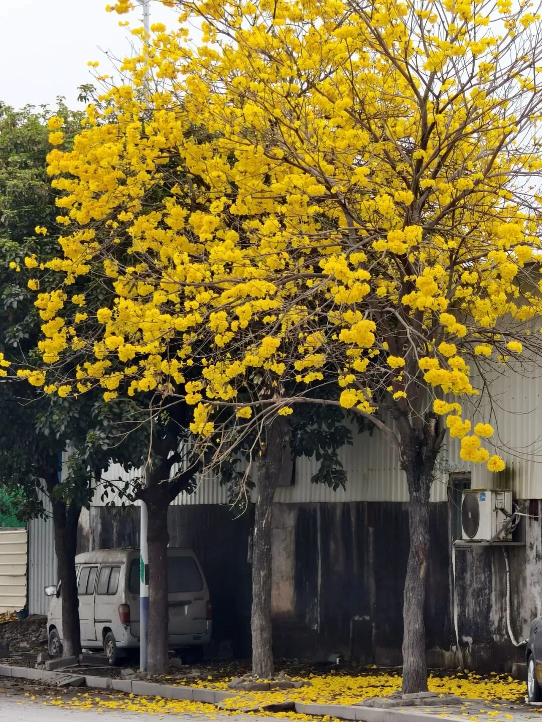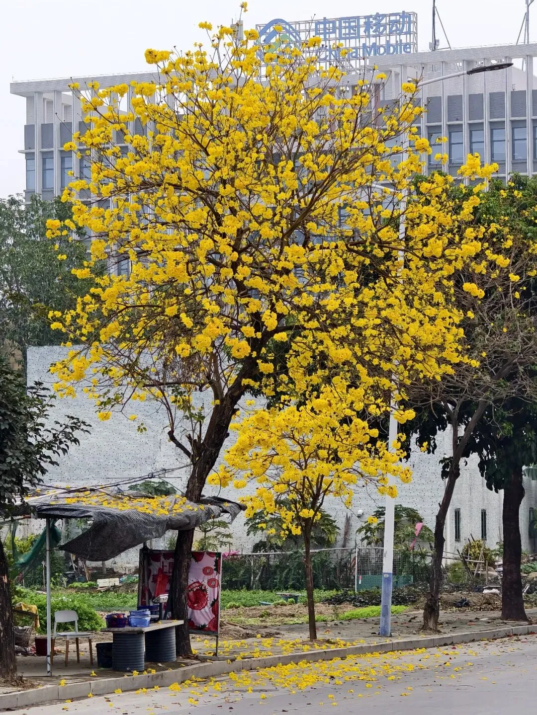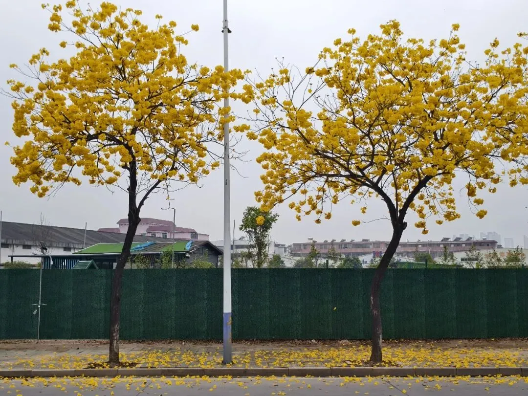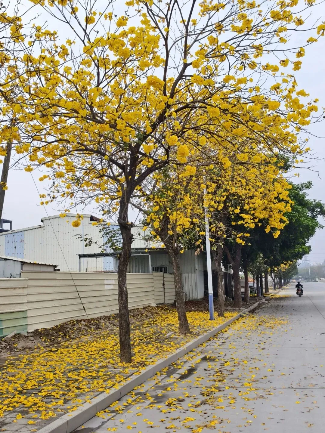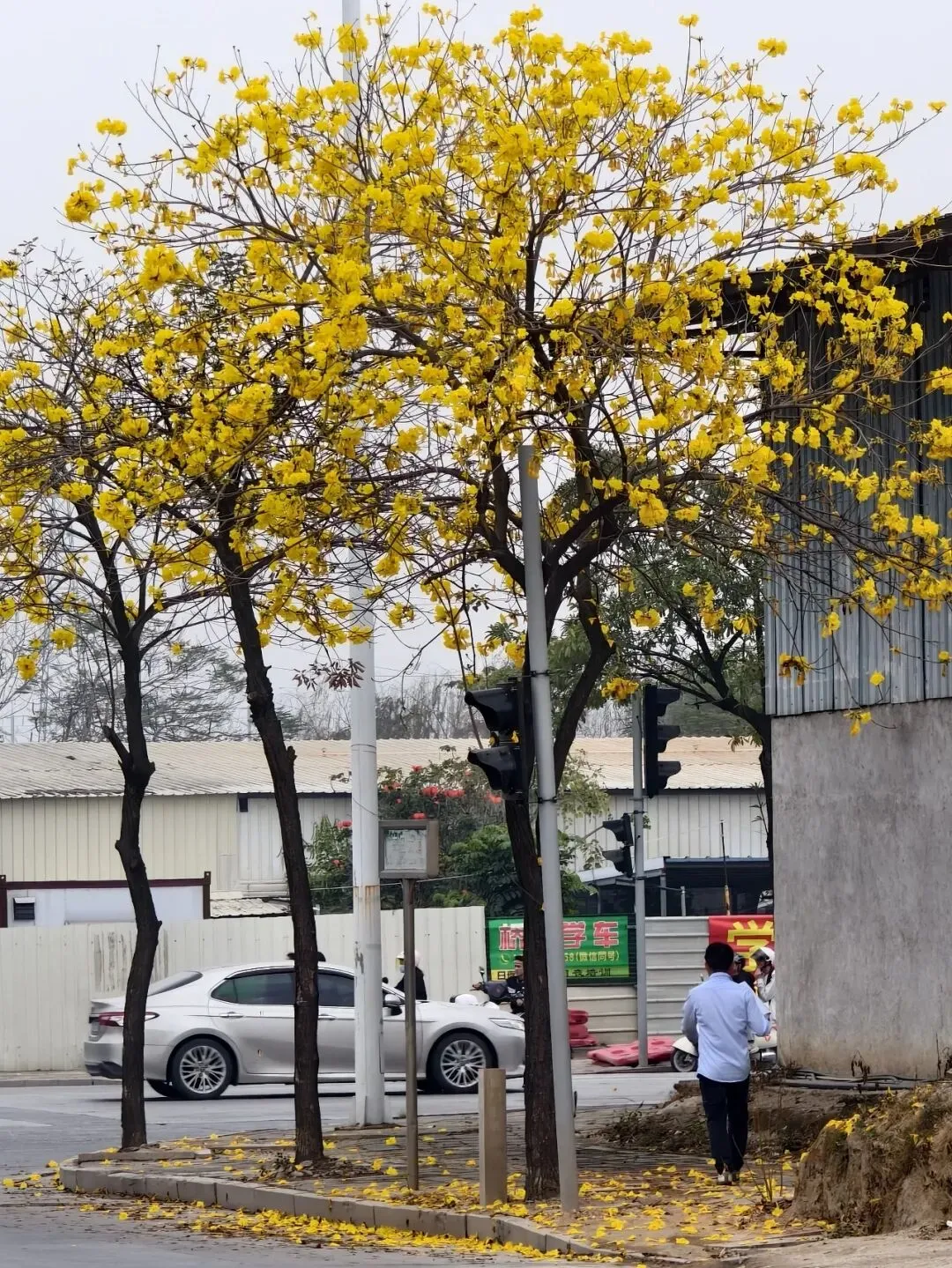 在揭阳市揭东区“县城”东面的车田大道上,两旁的黄花风铃木已盛开,一部分春节前后开的花瓣逐渐落地。树根旁,堆满金黄色的风铃花。(估计环卫工人要花费一定时间工作了,辛苦了!)
