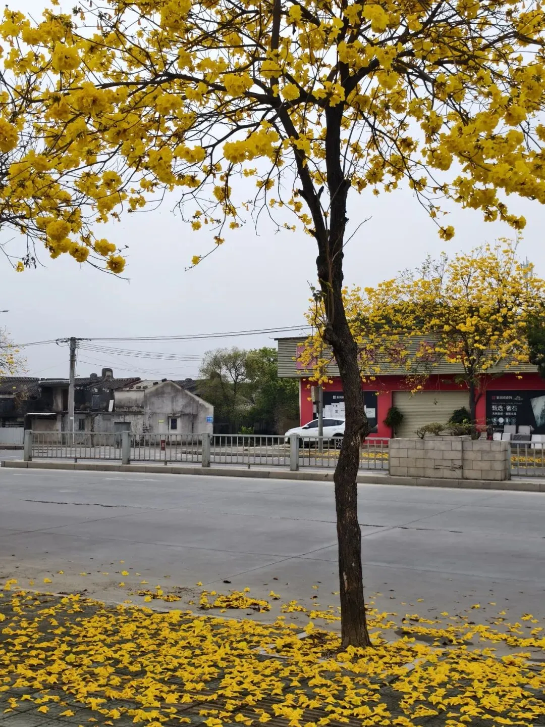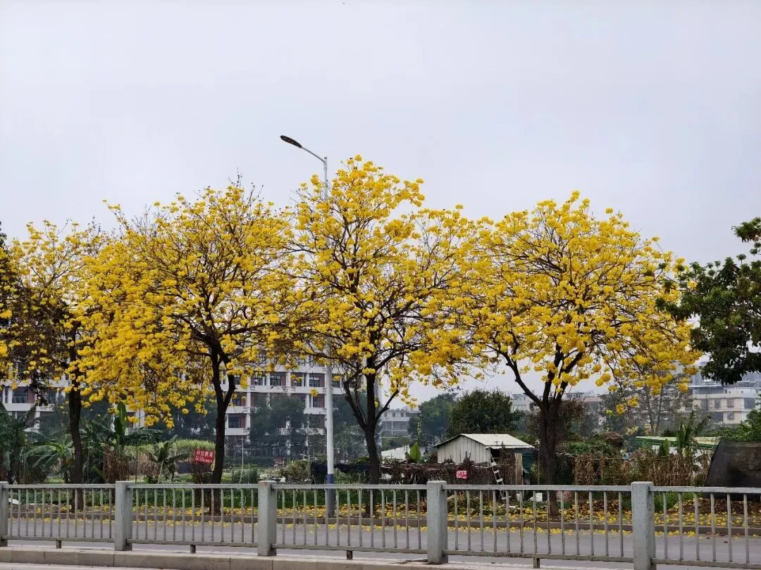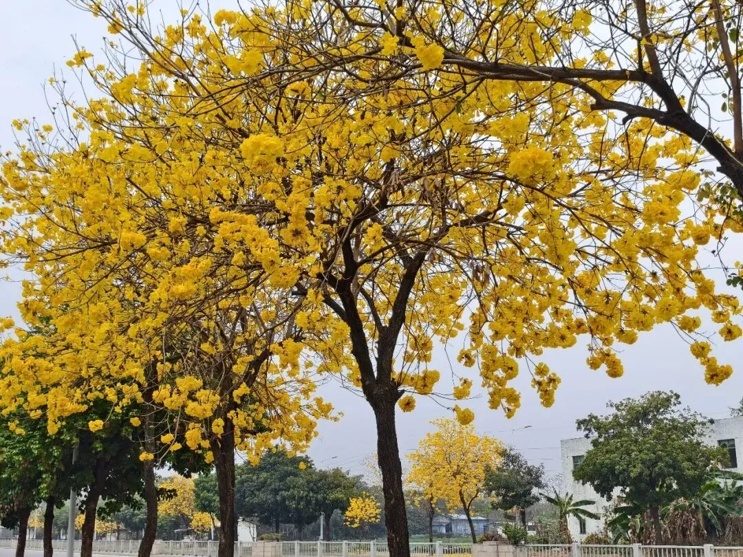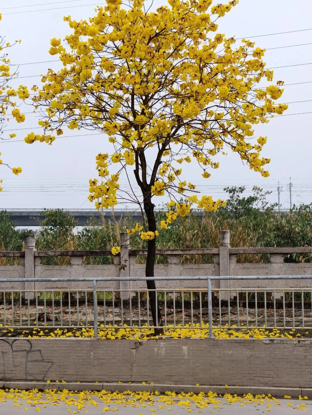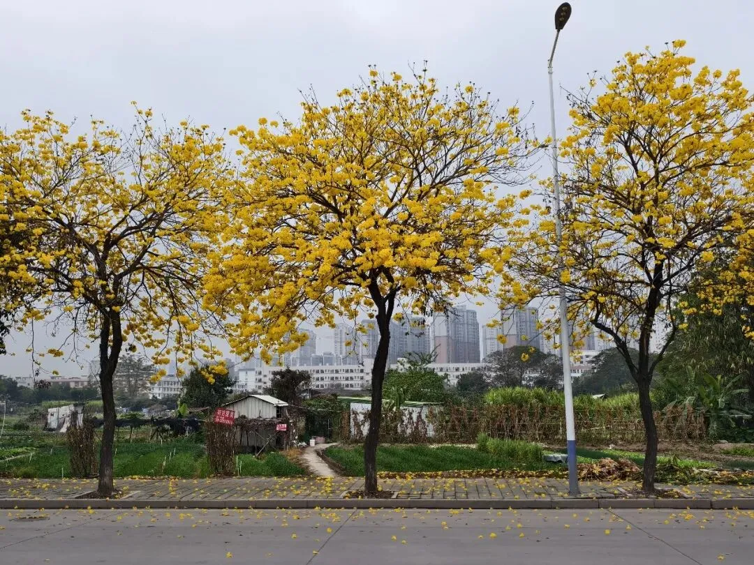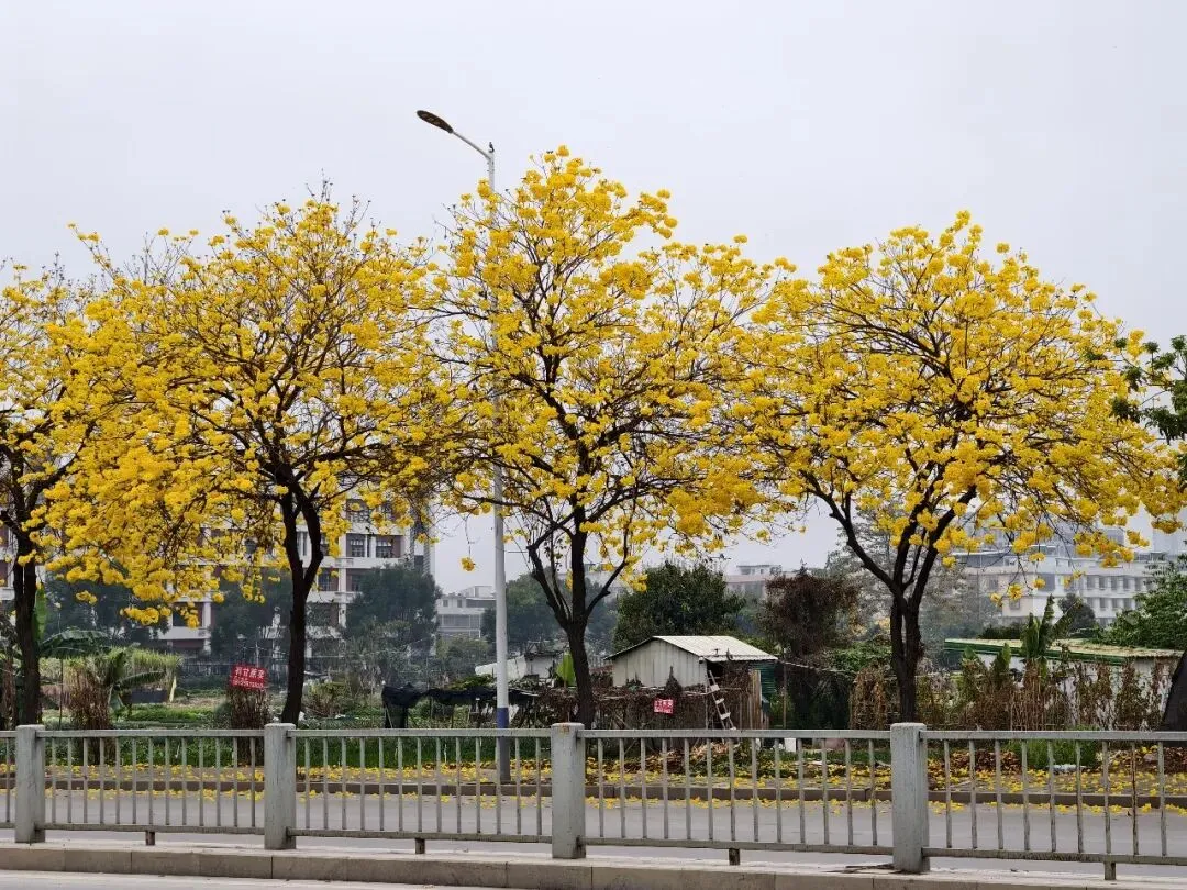 在揭阳市揭东区“县城”东面的车田大道上,两旁的黄花风铃木已盛开,一部分春节前后开的花瓣逐渐落地。树根旁,堆满金黄色的风铃花。(估计环卫工人要花费一定时间工作了,辛苦了!)