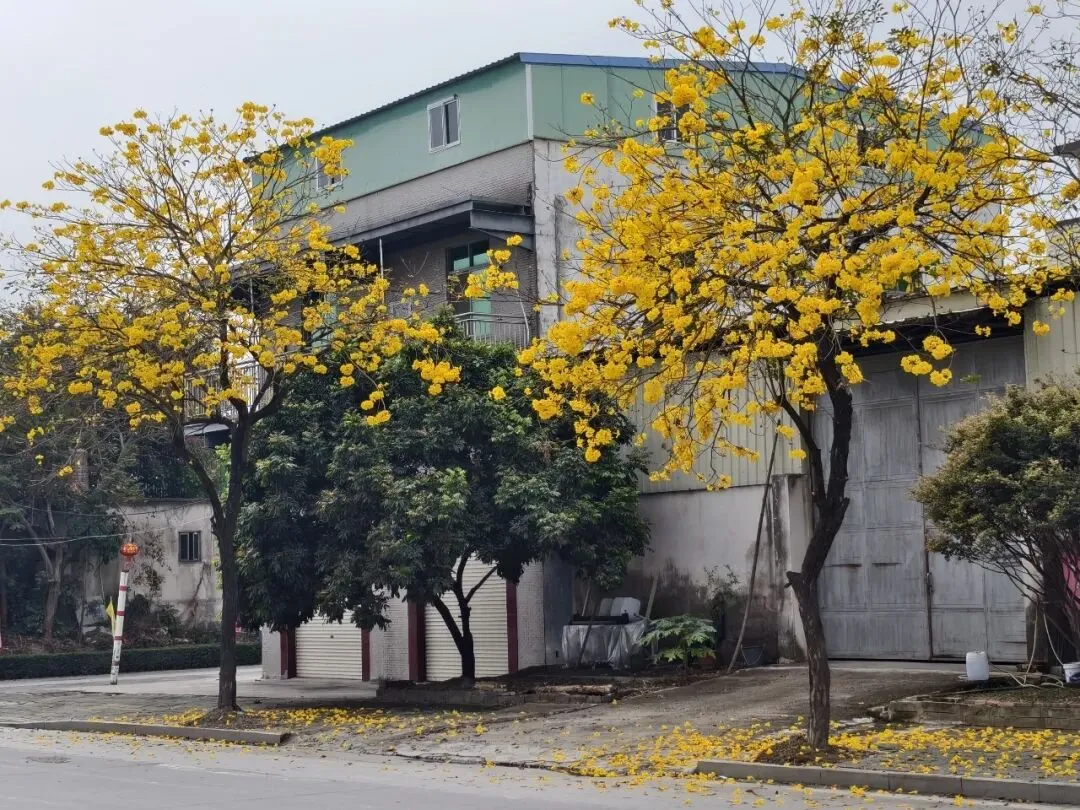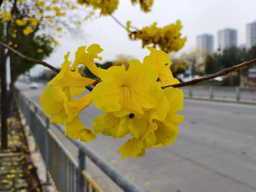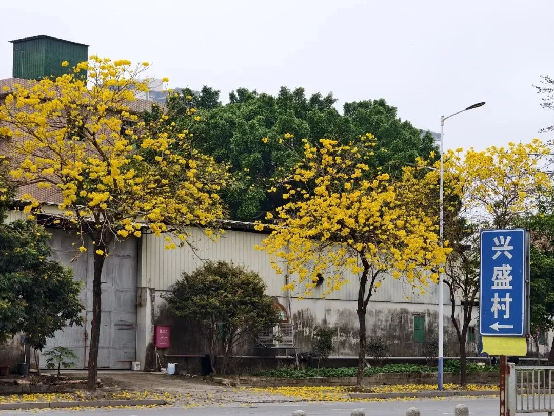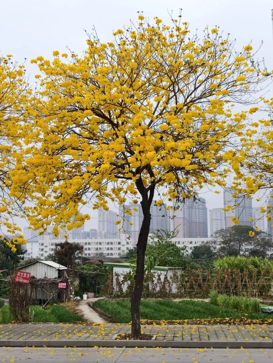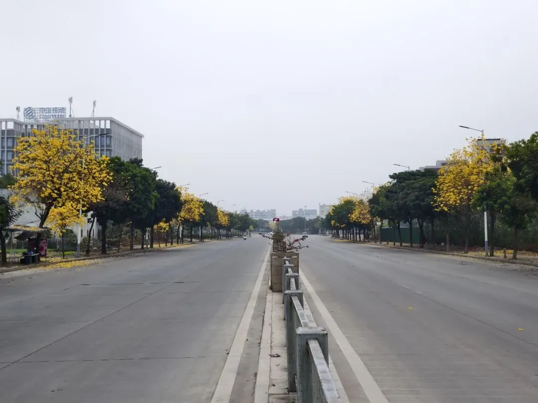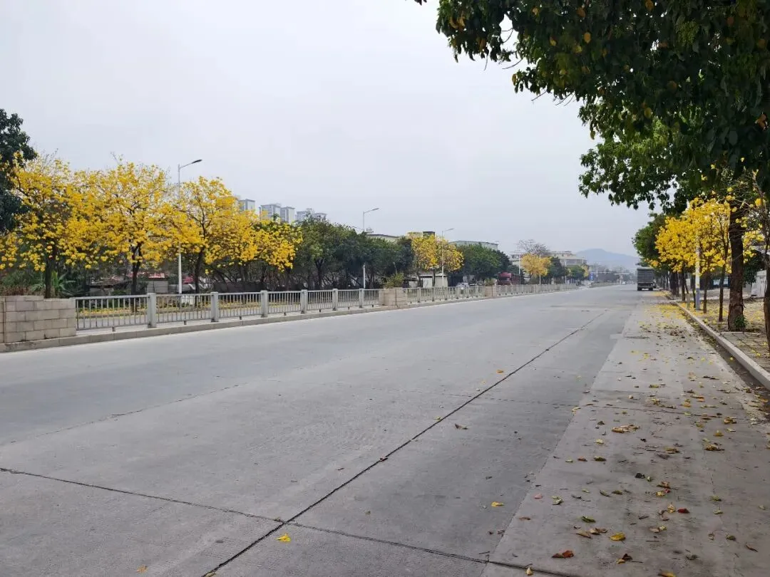 在揭阳市揭东区“县城”东面的车田大道上,两旁的黄花风铃木已盛开,一部分春节前后开的花瓣逐渐落地。树根旁,堆满金黄色的风铃花。(估计环卫工人要花费一定时间工作了,辛苦了!)