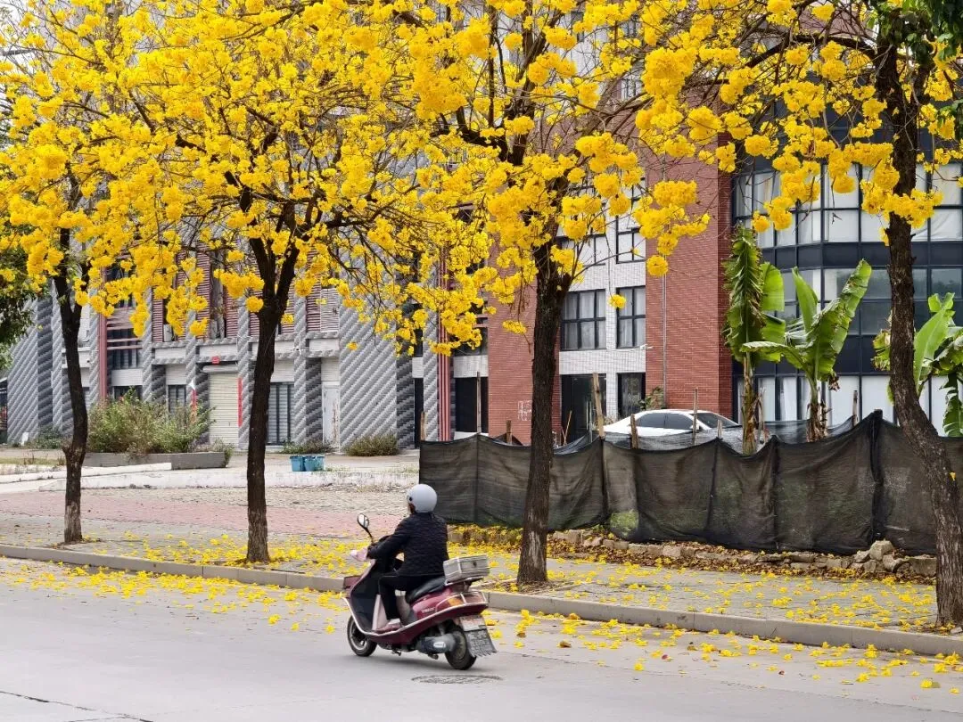 春风轻拂,风铃花如金色的雨般纷纷飘落。它们从枝头轻盈地坠下,似一只只翩翩起舞的黄蝴蝶,在空中划出优美的弧线,最终温柔地落在大地的怀抱中。