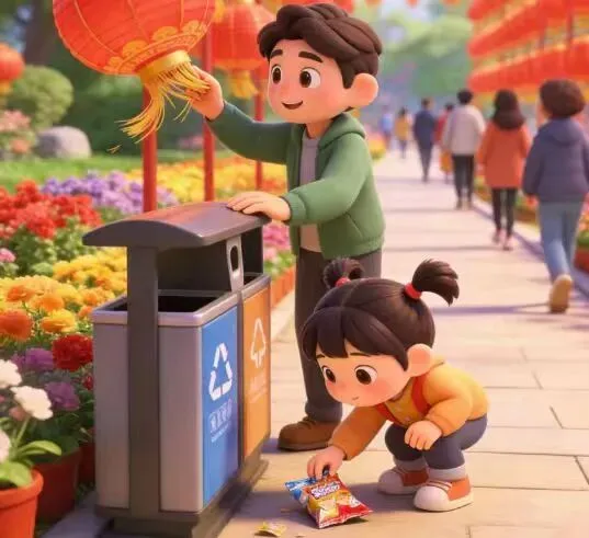 出游时自觉爱护景区花草绿植、景观装饰与公共设施,不踩踏草坪、不攀折花木、不损坏节日彩灯灯笼,有序打卡、共同守护整洁优美的节日环境。