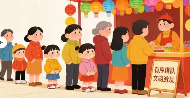 参与民俗体验、互动游戏等活动时,自觉排队,不插队拥挤,不大声喧哗,不占道久留,主动礼让老人小孩,让游玩更顺畅、更安心。