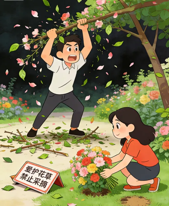 部分游客无视提示,随意采摘鲜花枝叶、踩踏草坪,甚至摇晃树木制造“花瓣雨”拍照,破坏自然景观,影响他人观赏体验。