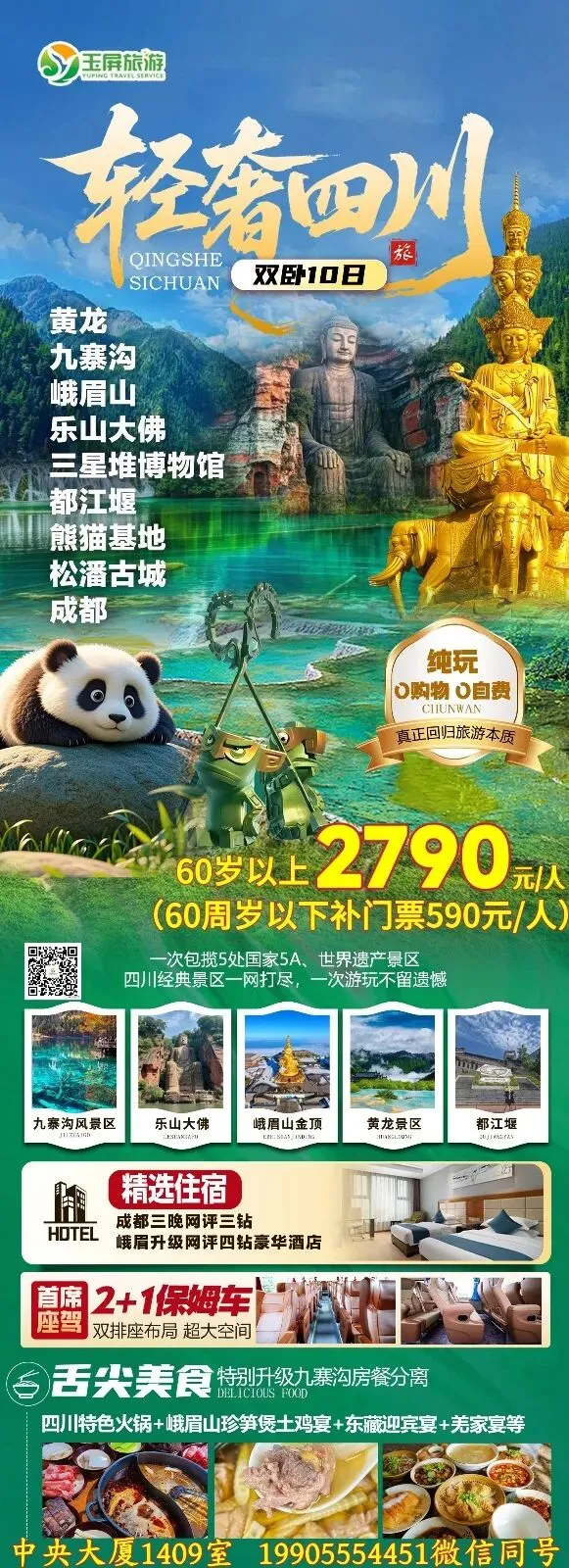 全景四川纯玩双卧10日游(2+1豪华大巴)