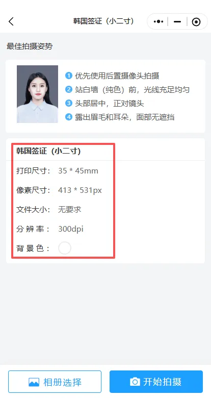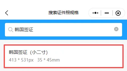 第2步:选择规格在搜索框里输入 “韩国签证” 系统会自动匹配标准尺寸。