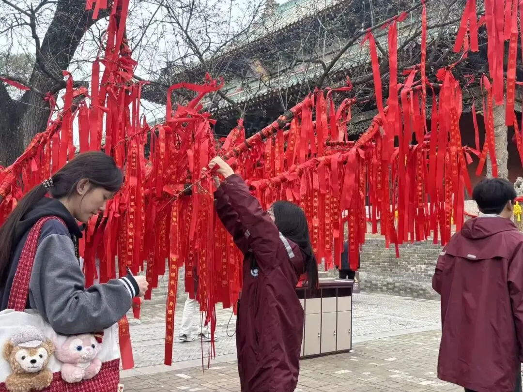 同学们在红色的祈福带上郑重写下自己的心愿,随后,他们将祈福带系上枝头,那一抹抹鲜红随风轻舞,承载着少年们对未来的无限憧憬。