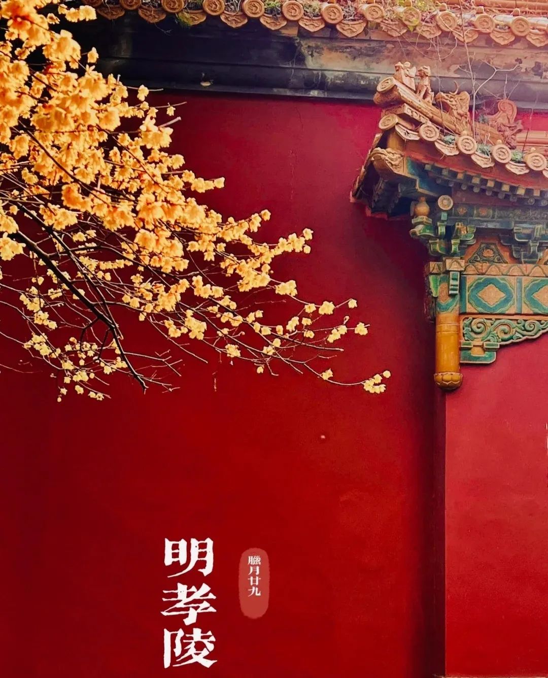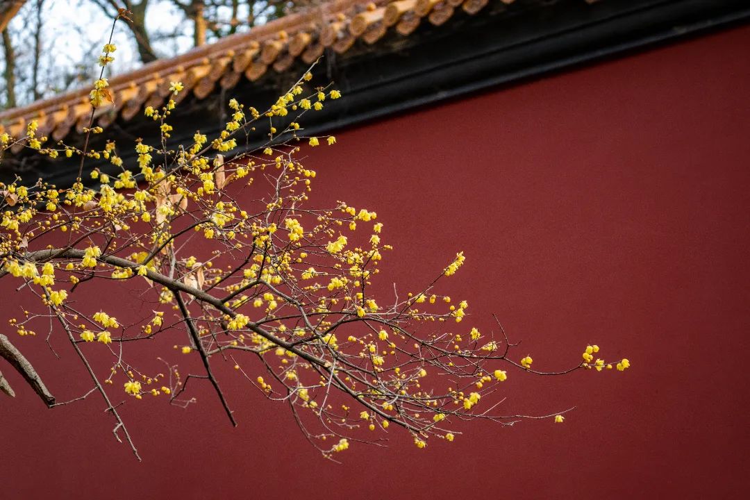 “红墙腊梅探出头,深院已知报春来”,斜阳打在墙头,几枝腊梅像是发夹一样,别在红墙金瓦的肩头,这番绝美景象在明孝陵演绎得淋漓尽致。