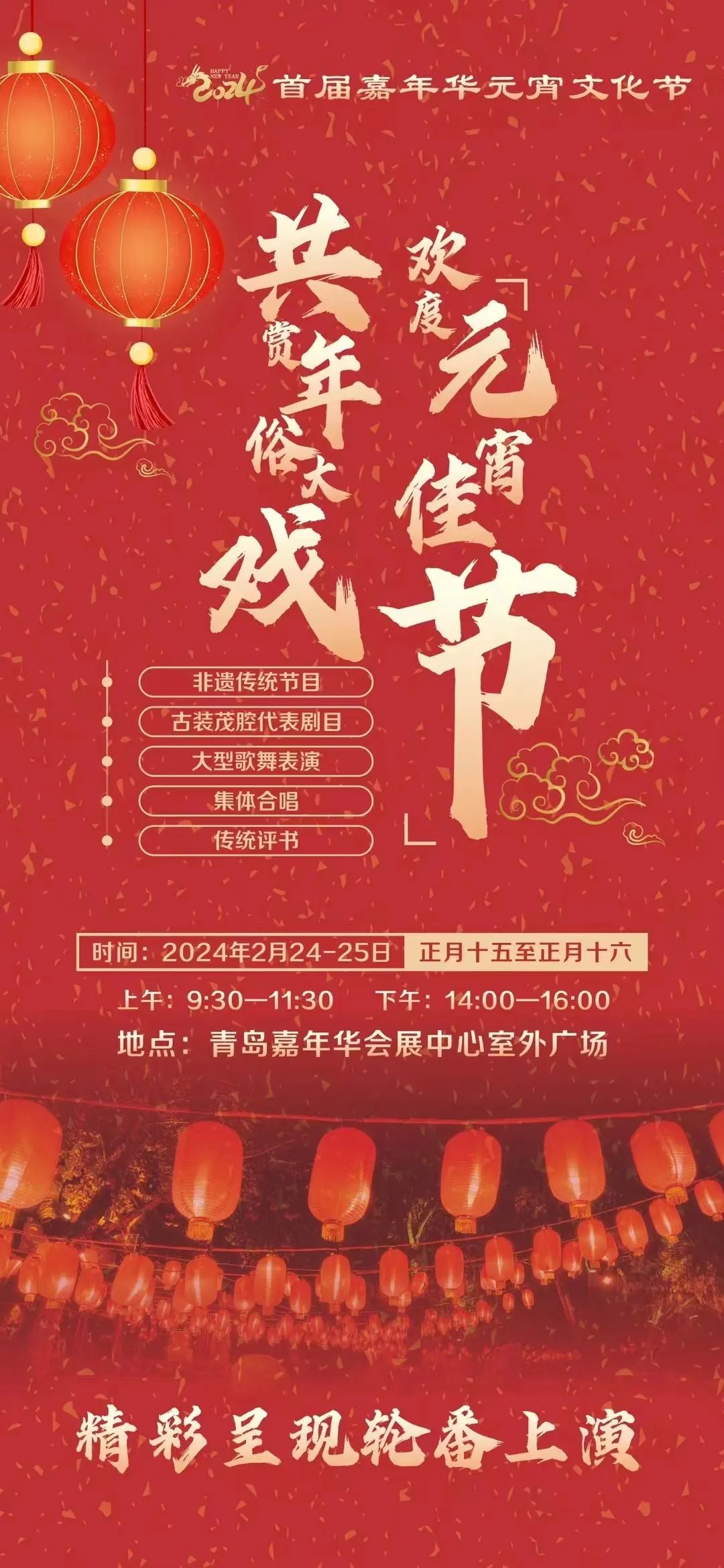 元宵佳节将至,为营造欢乐祥和的节庆氛围,青岛西海岸新区将举办2024青岛西海岸新区春节民间艺术表演活动,呈现多姿多彩的传统文化,为美好节日添福添彩。