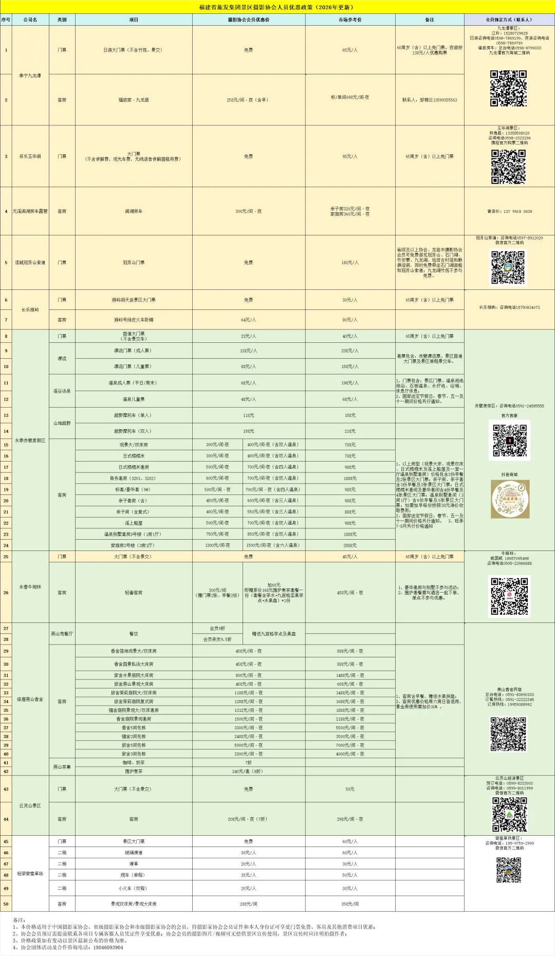 为强化福建旅发景区自然风光、风土人情等特色文化旅游资源宣传,助推“摄影+旅游”融合发展,经研究决定,自本公告发布起至2027年12月31日,市级以上摄影协会会员持摄影家协会会员证件和本人身份证到泰宁九龙潭、将乐玉华洞、柘荣鸳鸯草场、长乐猴屿、永春牛姆林、连城冠豸山景区、邵武云灵山景区可享受大门票免费,到永泰赤壁温泉酒店、梁厝燕山香舍、泰宁福旅家·九龙居等住宿餐饮5-8折等优惠政策。