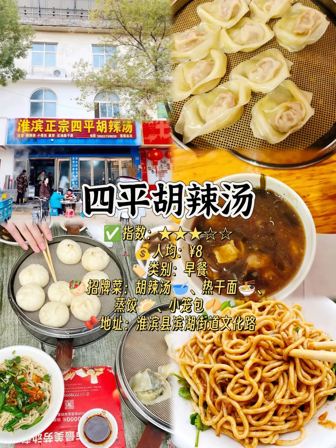 🥙招牌菜:胡辣汤🥣、热干面🍜、蒸饺🥟、小笼包🥠