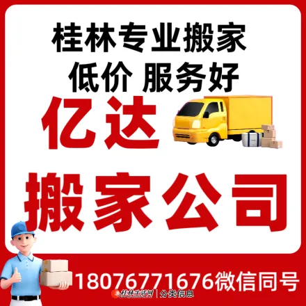 亿达搬家,专业搬家公司,安全放心又低价,服务好,全市24小时上门!桂林市内的个人桂林搬家,搬场,搬场公司业务,专业拆装衣柜,家私组装打包桂林搬厂服务。桂林市内的长短途搬家、搬厂、搬写字楼、卸货柜、搬钢琴桂林搬场服务。专业搬场、搬机器、拆装家具、空调安装等服务。欢迎各位来电咨询、预约18076771676周师傅(微信同号))以超低的价格,优质的服务广大市民,货运长中短途,谢谢来电!