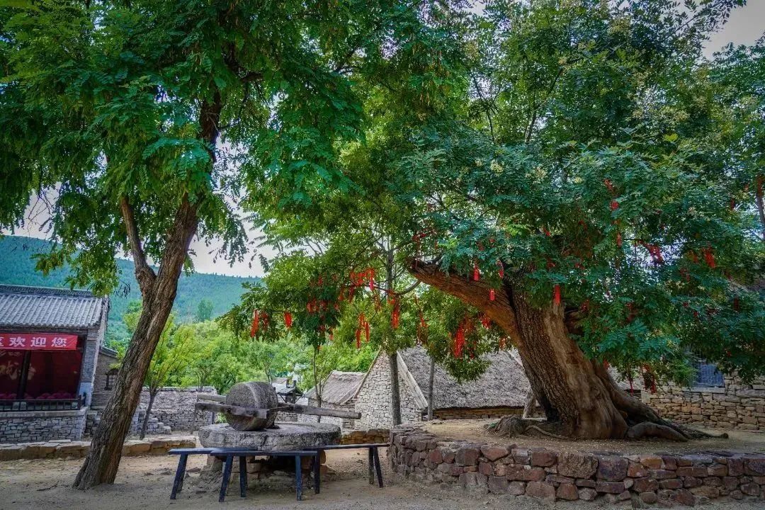 戏台旁边生长着一颗古树,上面挂满了红飘带,记录着游客们最虔诚的愿景,如果你累了的话可以坐在石墩上,或者靠着石碾歇息一下。
