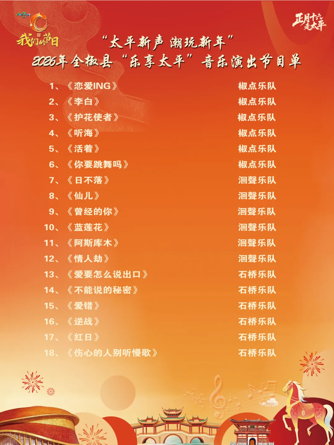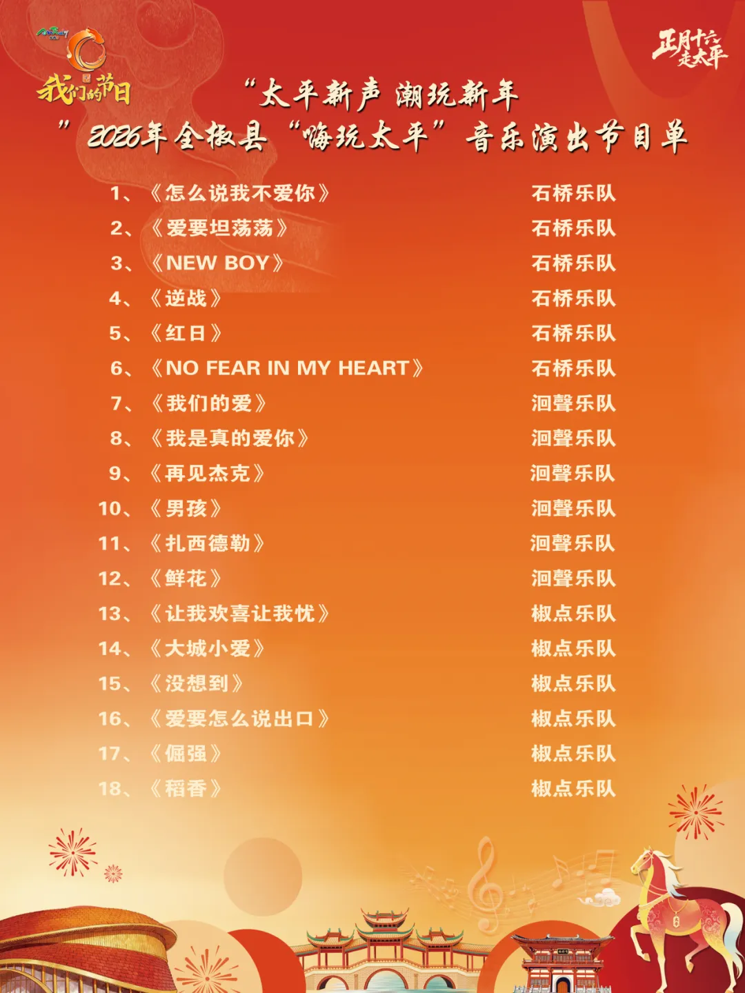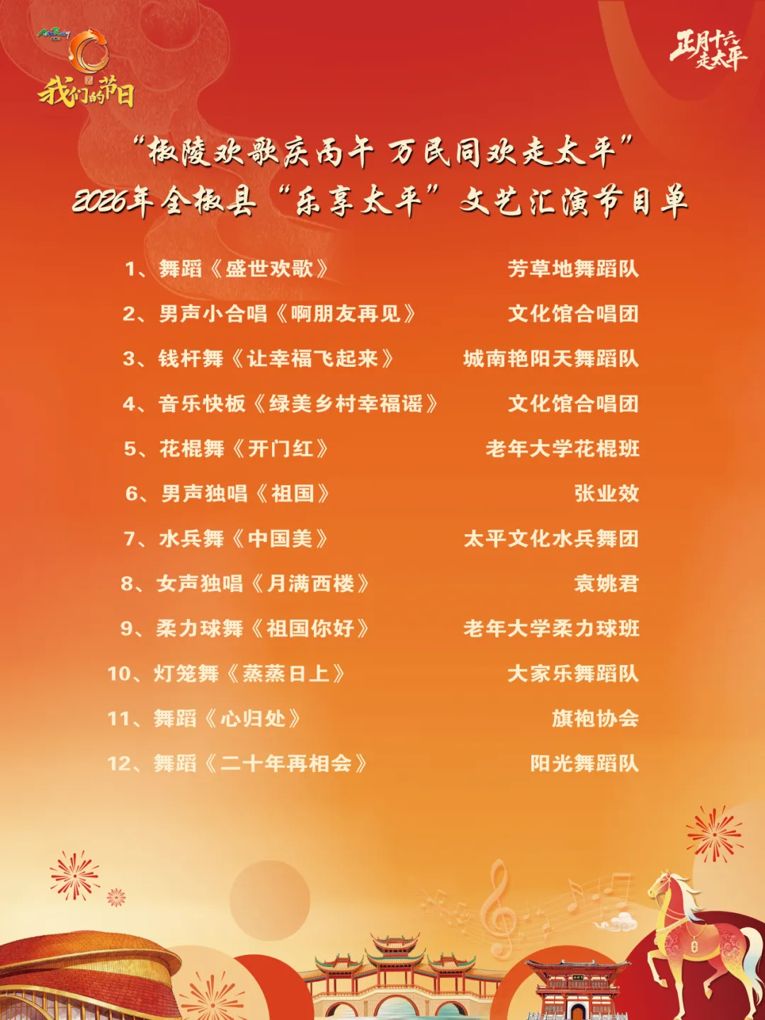 结合“送戏进村”活动,春节期间在太平文化广场举办送演出活动,丰富居民、游客“走太平”文化旅游周活动体验。