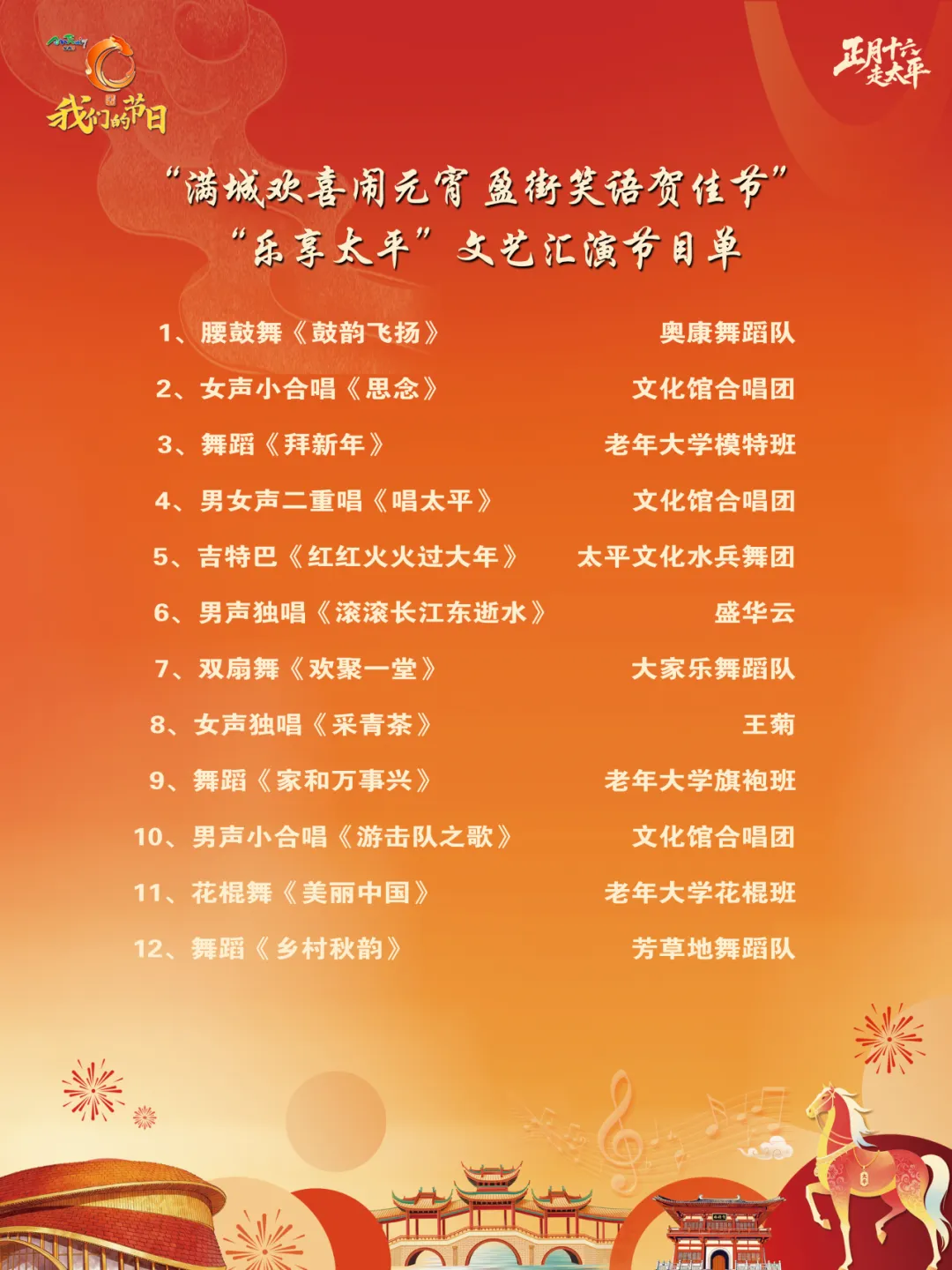 选调部分乡镇民间花灯队伍100人左右,在太平文化广场文化大舞台进行民俗表演,营造民俗活动氛围。