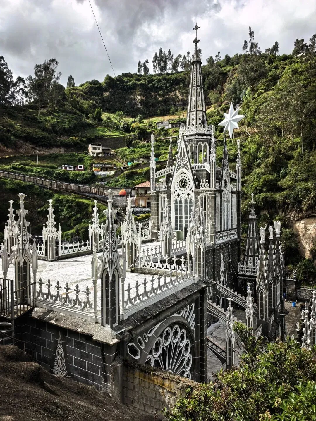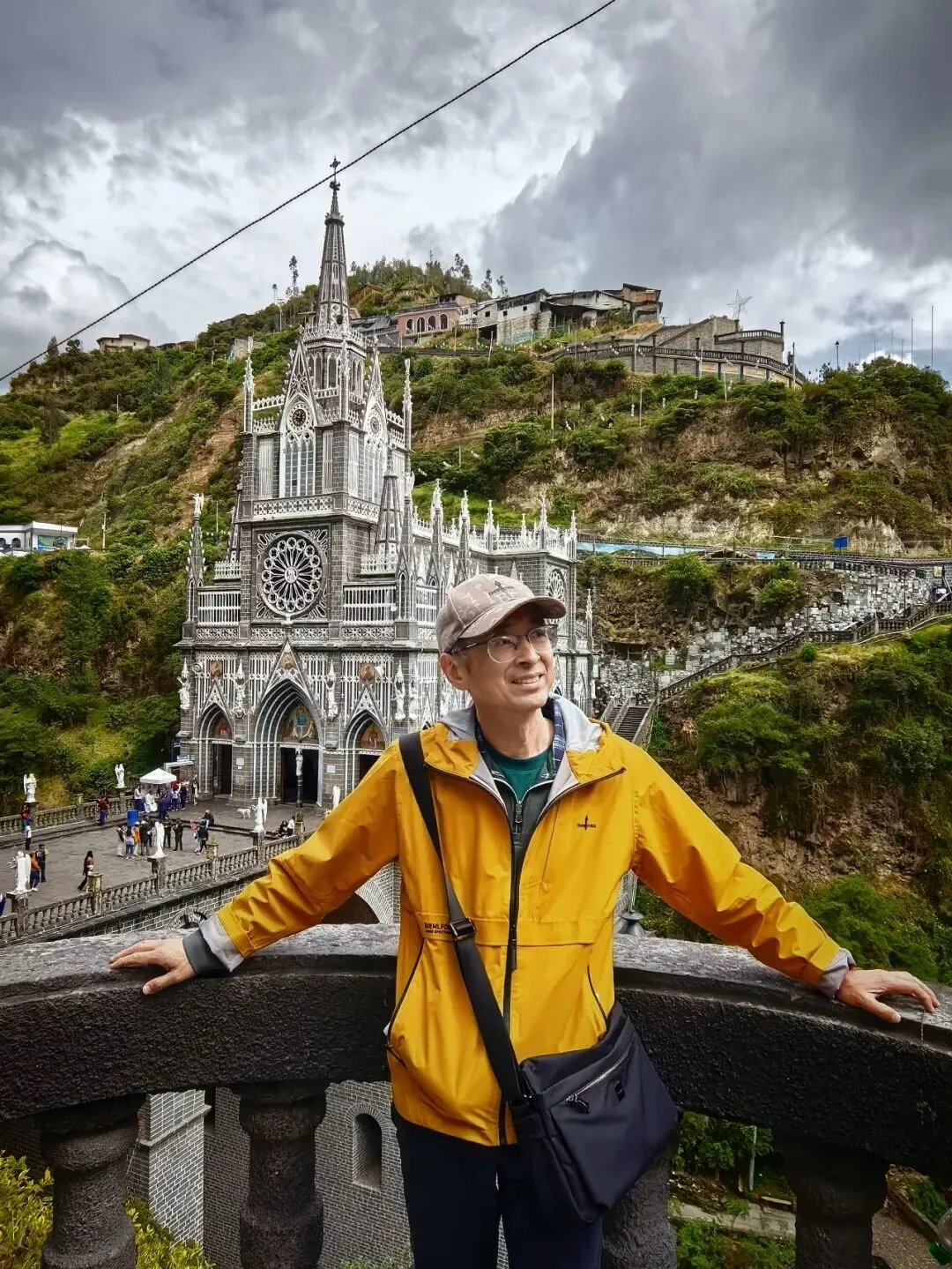 从边境到基多需五小时车程。沿途穿行崇山峻岭,高原草场如绿毯铺展,神似新西兰牧场,却因山势更显险峻;梯田层叠,林木交织,农舍静偎葱茏。气候更是莫测,车行时而在阳光中,时而被暴雨突袭,时而又没入云雾。好在泛美公路路况尚佳。途经城镇鲜有高楼,现代化气息淡薄,与哥伦比亚境况相似,一派质朴。