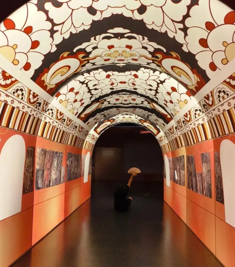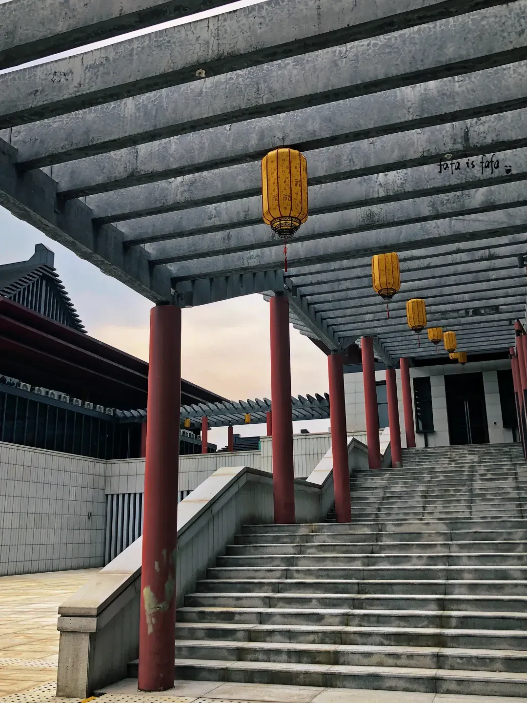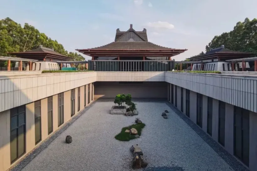 尤其是馆前的大台阶和新中式建筑超有气势,黑红配色的屋顶配着蓝天,随便拍都很出片。