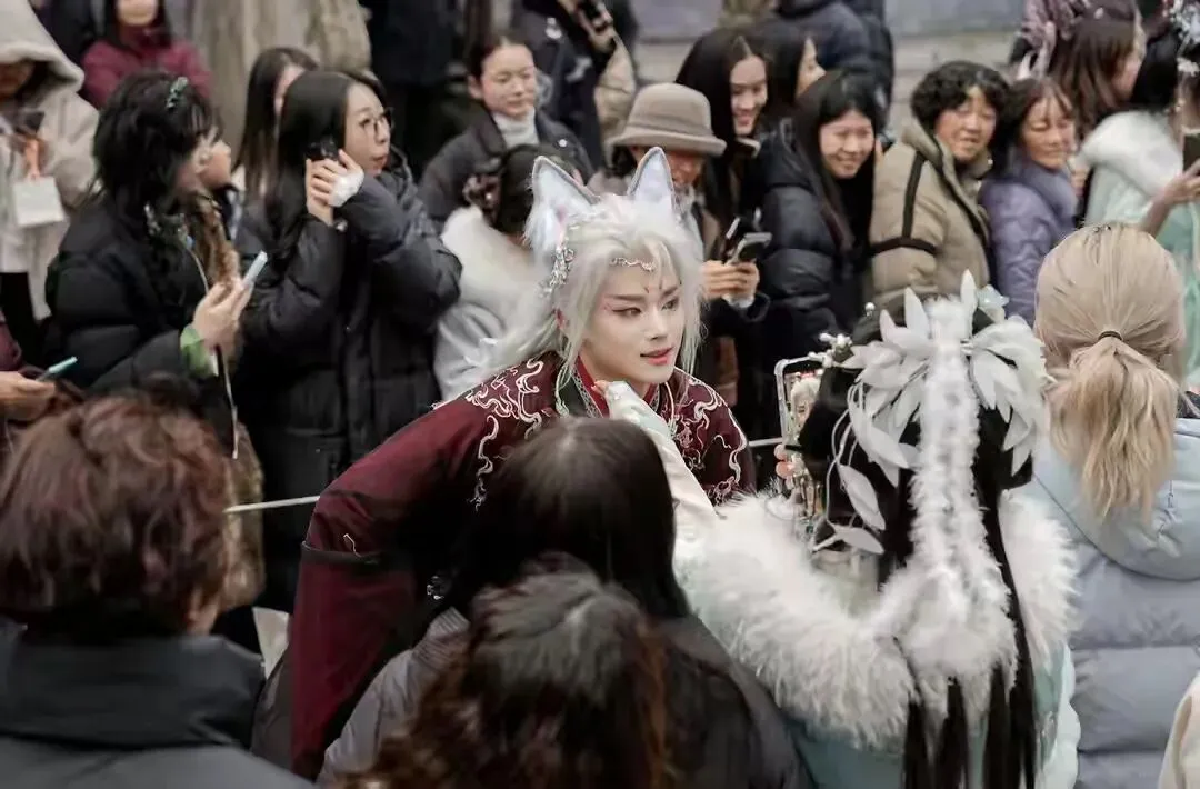 在洛阳,高颜值“霸总”NPC凭借壁咚、牵手等偶像剧桥段,直接火到海外,让景区门票预约一度排到半月之后;在横店影视城,23岁的王子澈扮演的“温情白总”,每天循环上岗十余小时,其温柔的互动风格收获了上千“迷妹”,成为景区的“活招牌”。不止于此,神农架的“野人”、长春的“雪饼猴”、开封的“武侠丐哥”,各式角色百花齐放,共同构成了文旅新图景。