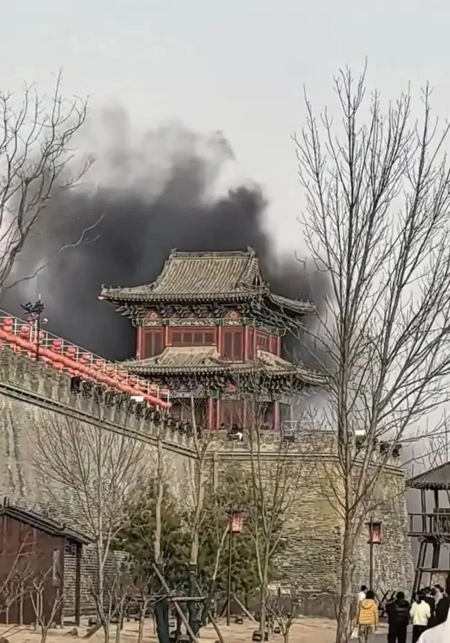 2月21日,多位网友发布视频称,下午5时许,位于河北邯郸市永年区广府镇的广府古城景区一座角楼突然着火。