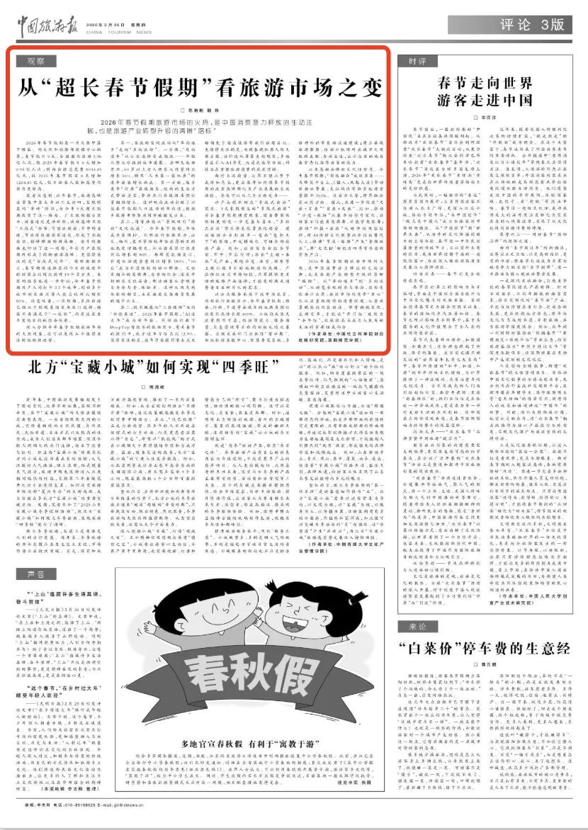 2026年春节假期旅游市场的火热,是中国消费潜力释放的生动注脚,也是旅游产业转型升级的清晰“路标”。从“单向返乡”到“多向流动”,从游览参观到参与体验,这些变化告诉业界:旅游市场的竞争“重心”已从流量规模转向消费深度,从资源禀赋转向内容创造。唯有拥抱变化、主动变革,才能让“开门红”延续为“全年红”,让旅游真正成为人民美好生活的重要组成部分。(作者单位:中国社会科学院财经战略研究院、洛阳师范学院)