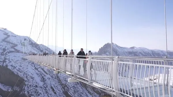 在肯斯瓦特蓝湖景区,银装素裹、人流如织。游客漫步玻璃桥、乘坐索道,在惊险体验与冰雪美景中欢度新春佳节。
